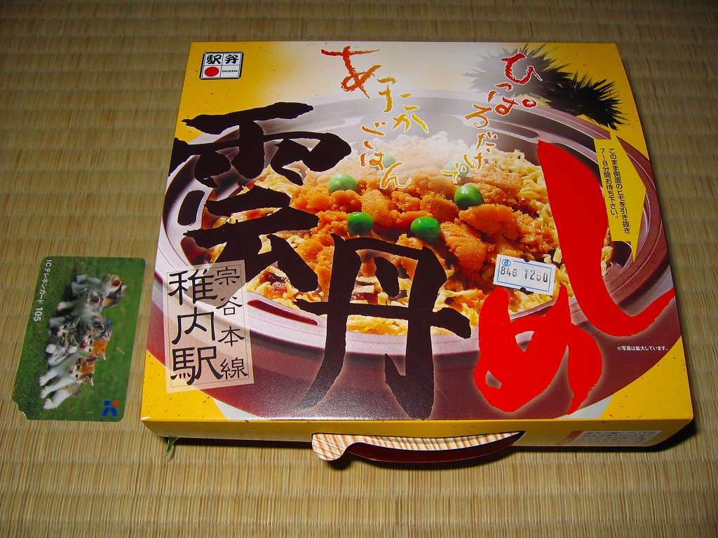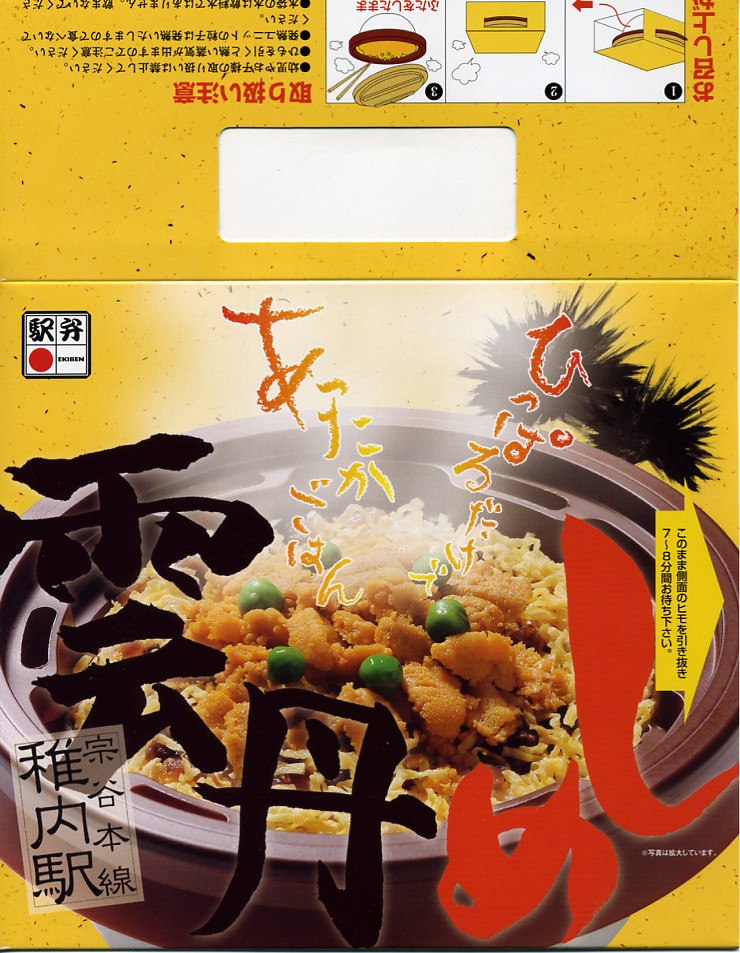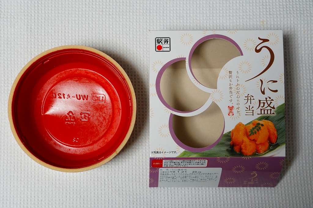 円形の加熱機能付き容器を、中身の写真を美しく載せて商品名と駅名を大書きしたボール紙の枠にはめる。中身は醤油飯の上に錦糸卵を敷いて蒸しウニとグリーンピースを散らす、ありがちなウニ弁当。風味は見た目どおり。