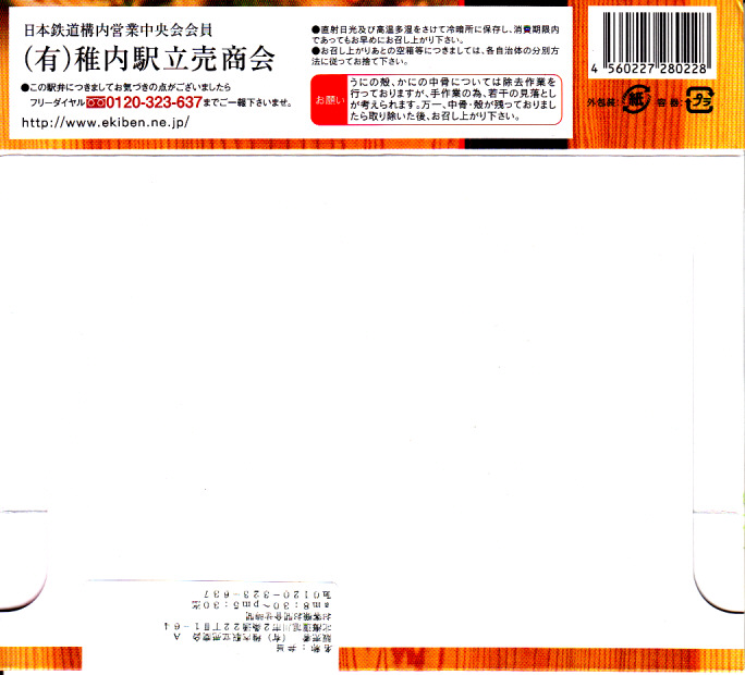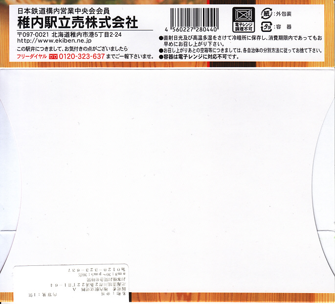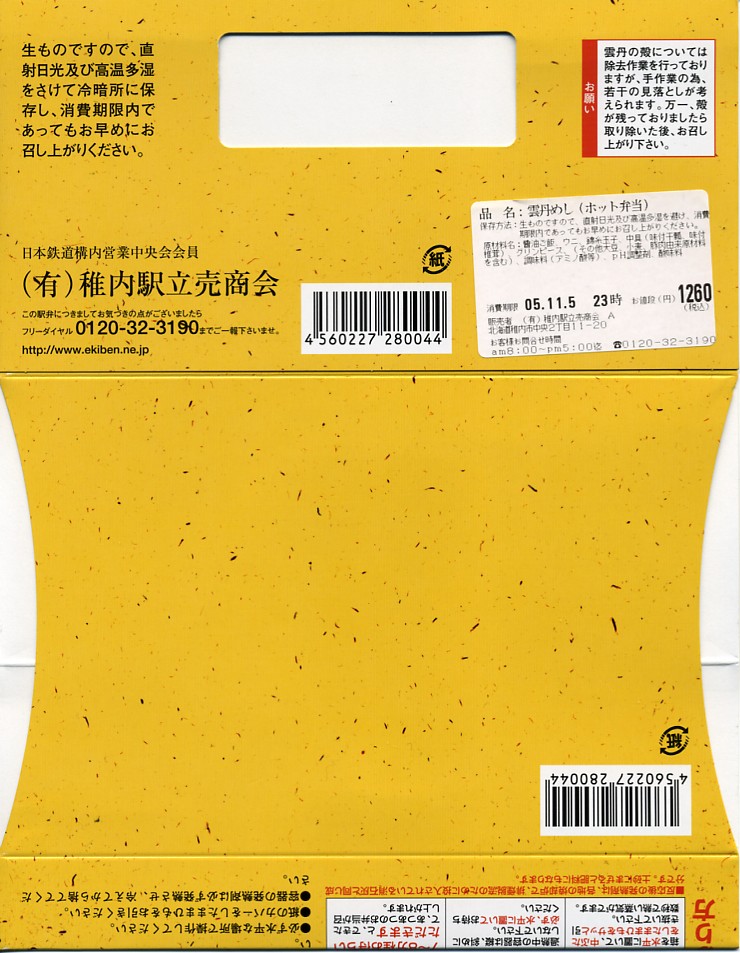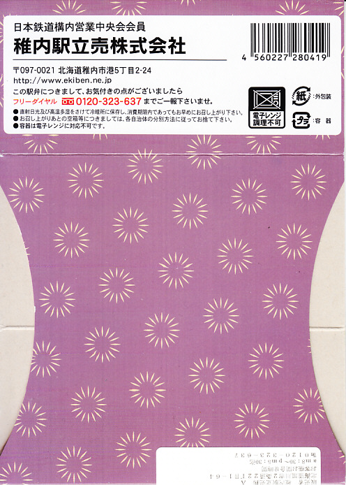 2004年1月以降の稚内駅には、予約制駅売り弁当や特急車内販売弁当として駅舎内食堂「ふじ田」製品があるが、通常の駅弁販売はない。この駅弁の調製元として書かれる「稚内駅立売商会」は、該当所在地で電話帳に掲載がないし、電話番号も他の疑義駅弁共通のフリーダイヤルで、URLは旭川駅立売商会。これは稚内の駅弁ではなく旭川の傀儡(かいらい)駅弁ではないかと思う。なお、2010年頃から他の稚内駅弁で、調製元所在地が旭川駅弁当と同一に変わったことは確認している。2011年頃までの販売か。