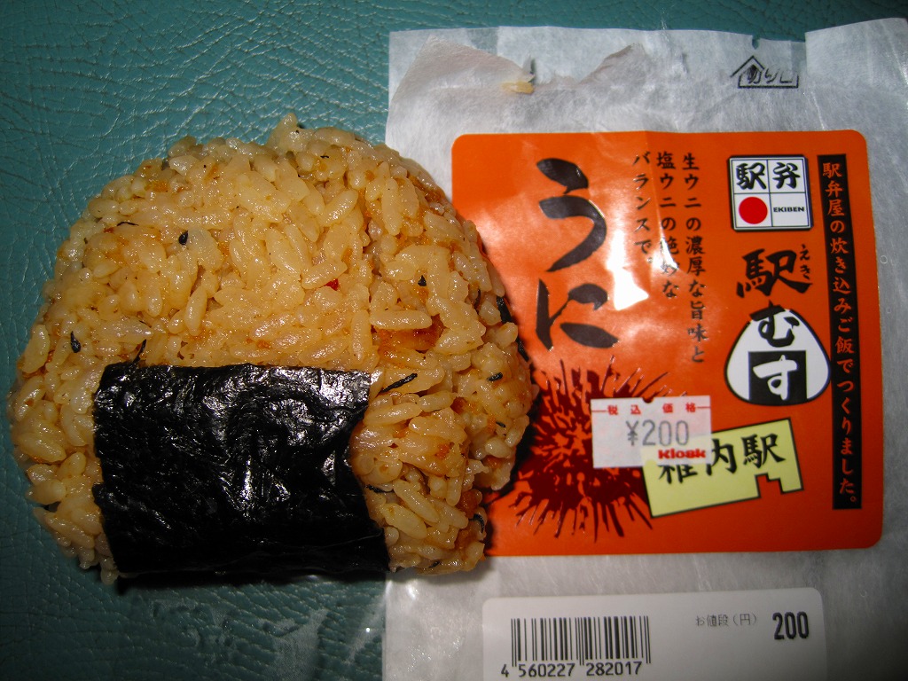 2009(平成21)年に「稚内駅 うに」「根室駅 炒りズワイ蟹」「洞爺駅 ほたて」「釧路駅 炒りズワイ蟹」の4種が誕生か。外見も中身も内容も、全国のコンビニエンスストアで見掛けるような高級高額おにぎりで、「うに」と書いてあるから御飯にウニの混ぜ御飯を使っている。味もコンビニと同等な印象。