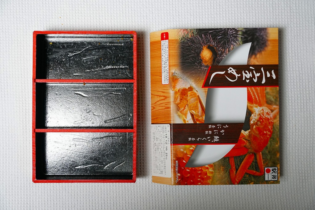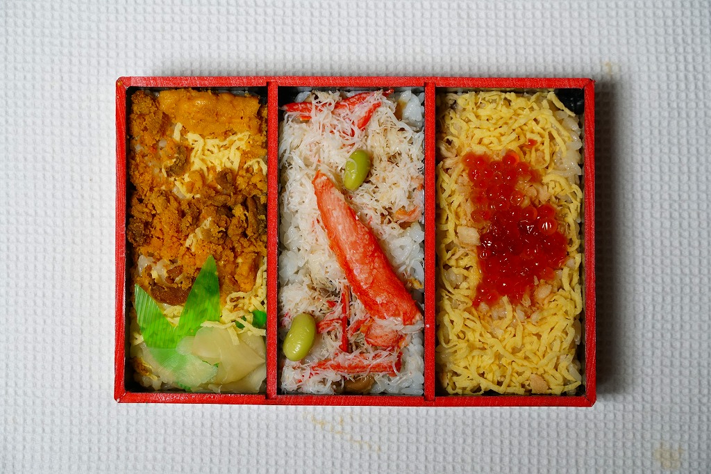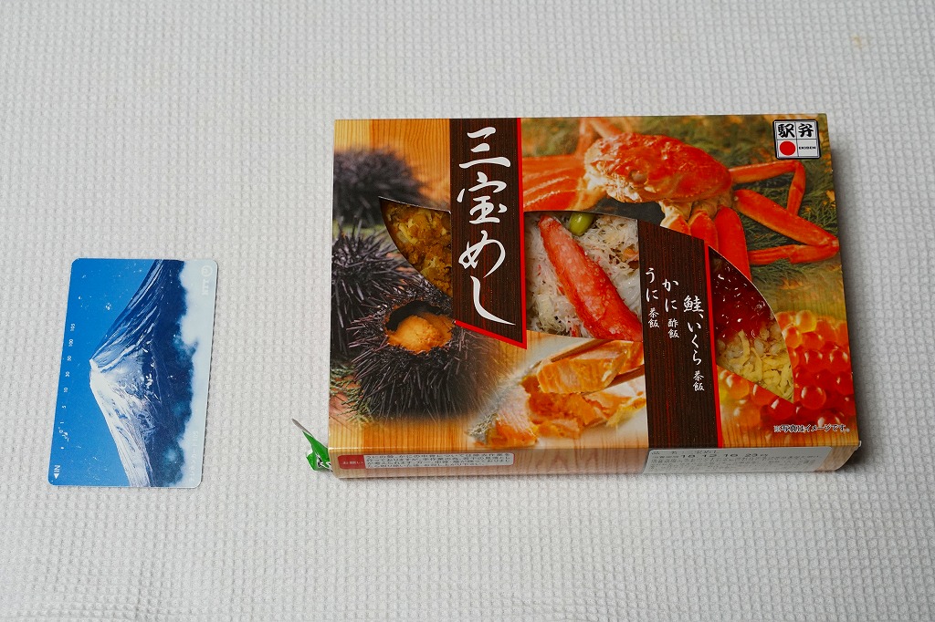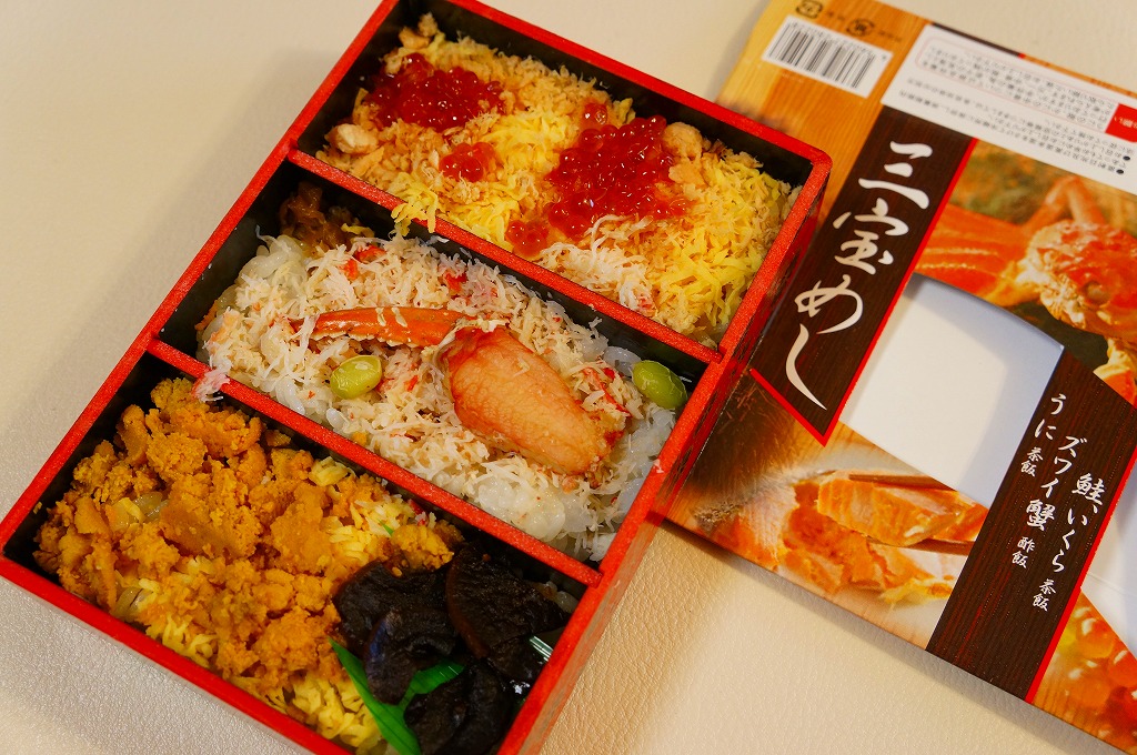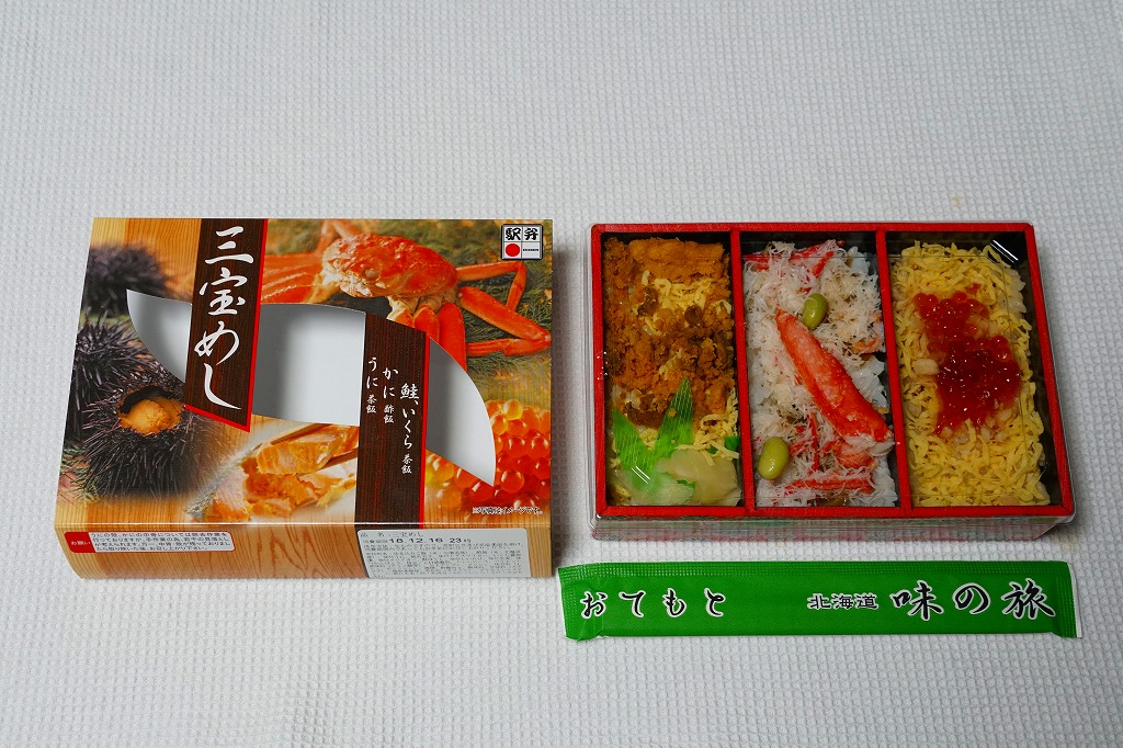 秋冬の駅弁大会シーズンに向けた、2012(平成24)年の秋頃の発売か。容器を3区画に仕切り、茶飯に蒸しウニとガリを載せるウニ丼、酢飯をズワイガニの爪とほぐし身で覆うカニ丼、茶飯を鮭フレークとイクラ醤油漬と錦糸卵で覆う鮭いくら丼を詰める。「宝」を名乗るような豪華さまでは持たないものの、分かりやすい味と内容。今回は東京駅で買ったが、レシートの表記は不思議と「三宝めし旭川」で、稚内駅でない駅名が記された。価格は2018年の購入時で1,180円、2021年時点で1,280円。2021年の春頃に終売か。