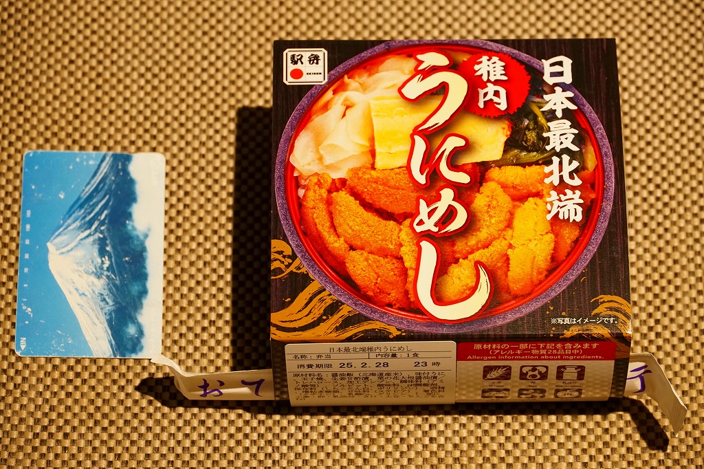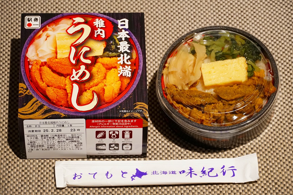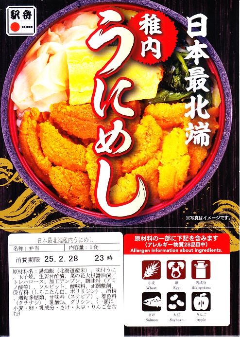 秋冬の駅弁大会シーズンに向けた、2024(令和6)年秋の新商品か。黒くて丸い容器に醤油飯を詰め、ウニと玉子焼と菜の花と甘酢生姜で覆い、その中身の写真を使うスリーブに収める。「稚内」の文字が見えなければ、旭川駅か八戸駅かかつての釧路駅か、どこのものかわからないと思う催事向け商品。主に秋冬の全国各地のスーパーマーケットで売られるが、稚内駅の商業施設でも輸送販売され、いずれも旭川で作っている。