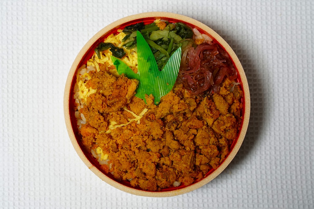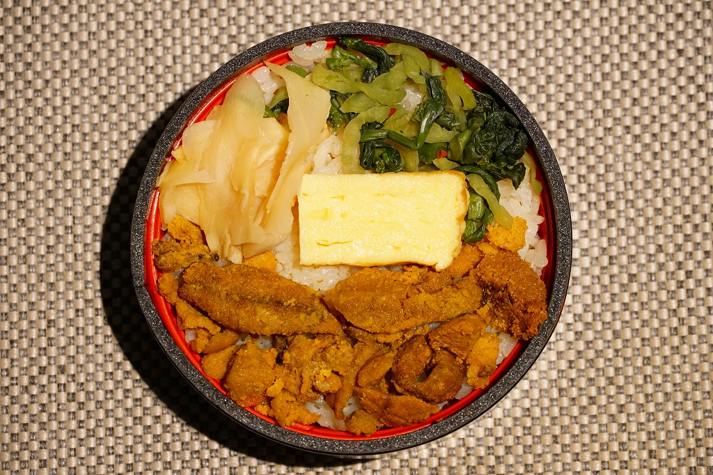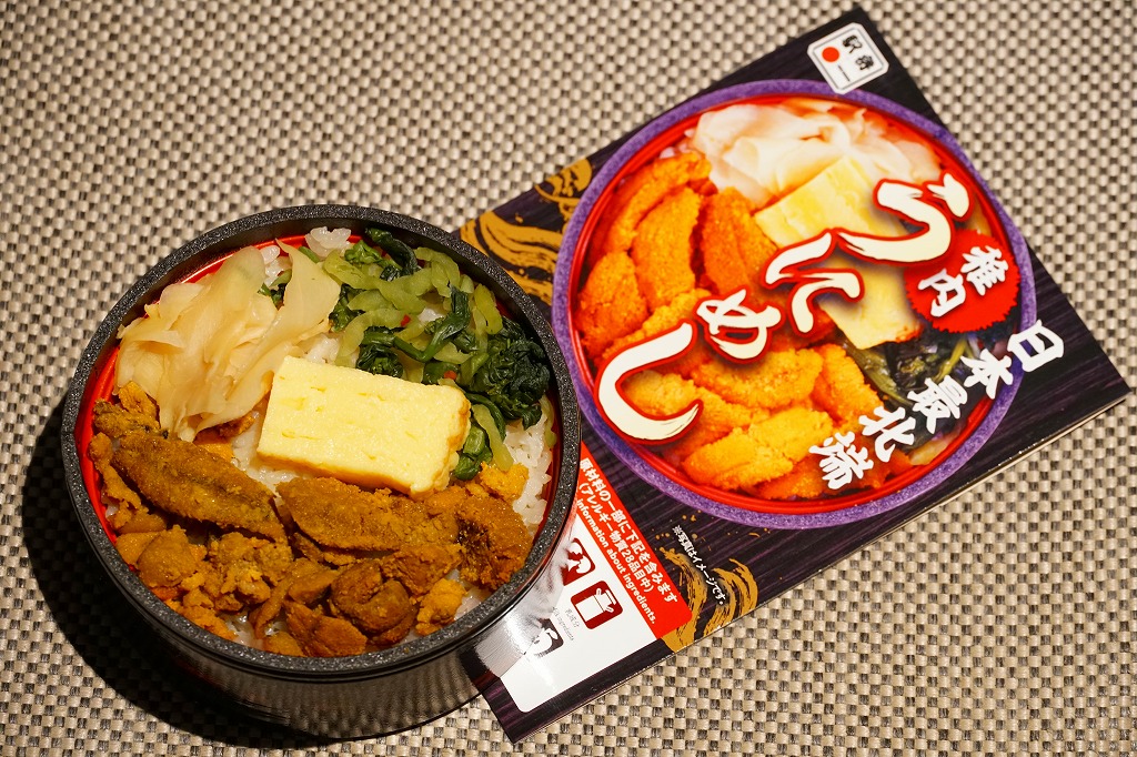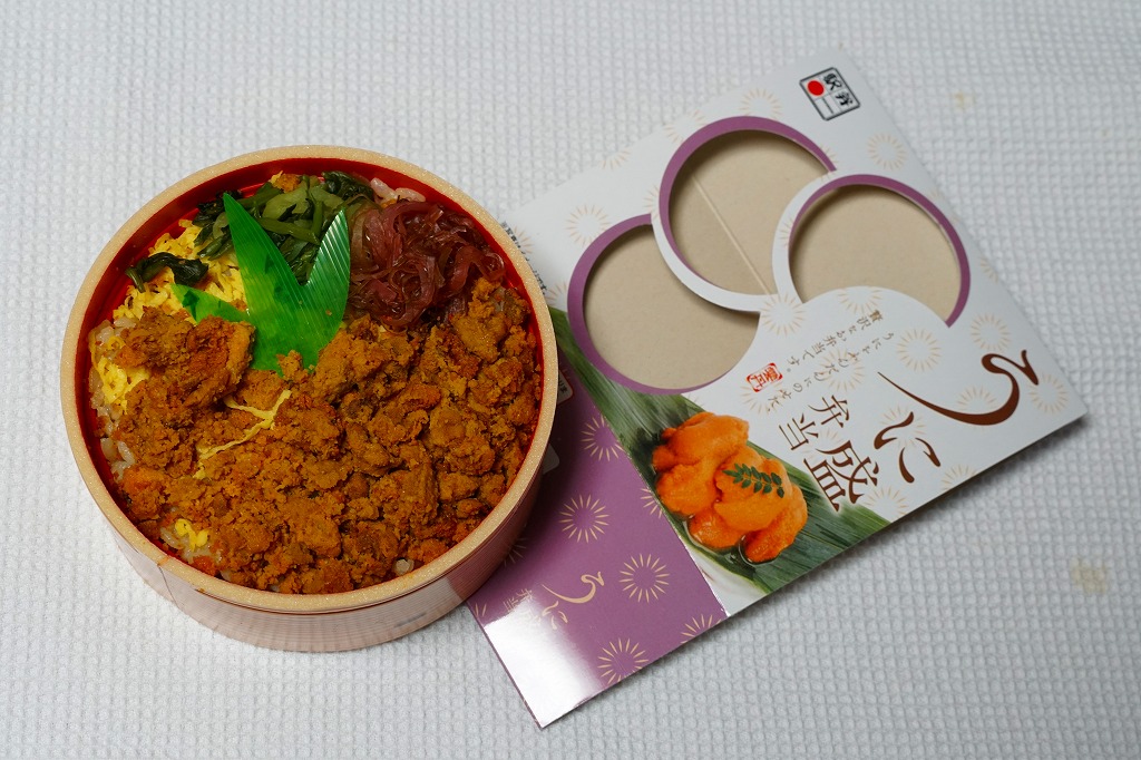 2017(平成29)年夏の発売か。丸い容器にウニ飯を詰め、蒸しウニ、錦糸卵、ワカメ酢漬け、小松菜醤油漬で覆う。つまり人気の稚内駅弁「うに壷」とほぼ同じ中身であり、味も同じようなもの。蒸しうにそぼろの分量は、こちらのほうが多い気がした。2020年に終売か。