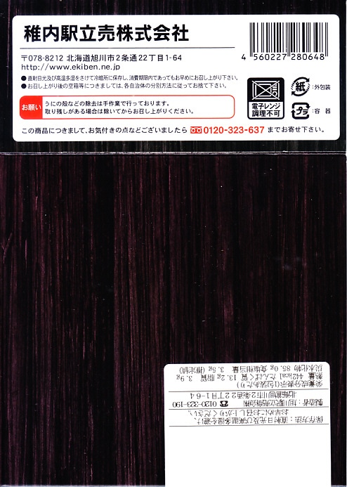 商品シールに駅名と駅弁マークが入り、駅でちゃんと売られていれば、駅弁だと受け止められなくもない。しかし稚内駅で「根室駅 炒りズワイ蟹」「洞爺駅 ほたて」とか売られていると、疑義駅弁の延長上にあるものだとも見える。この商品の食品表示ラベルには旭川駅立売株式会社の所在地が書かれているため、旭川でまとめて製造して道内各駅に配送しているのだろうか。そんな点でもコンビニおにぎりしてる。2015年頃までの販売か。