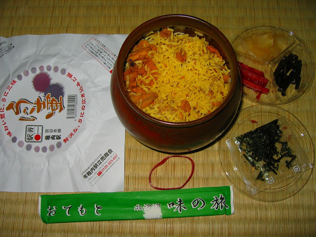 2007(平成19)年6月付けで新商品として旭川駅立売から発表され、2007〜2008年の駅弁大会シーズンにスーパーの駅弁催事で人気を集めた、収穫当時は稚内駅を代表する疑義駅弁。壷型というには丸みのある陶製容器に透明なふたをして、商品名を書いた掛紙をかけて輪ゴムでしばる。中身はウニとひじきの炊込飯に錦糸卵と蒸しウニをふりかけ、その上に透明なトレーで梅ごぼう、いも茎、生姜酢漬を添えて、刻み海苔を付ける。