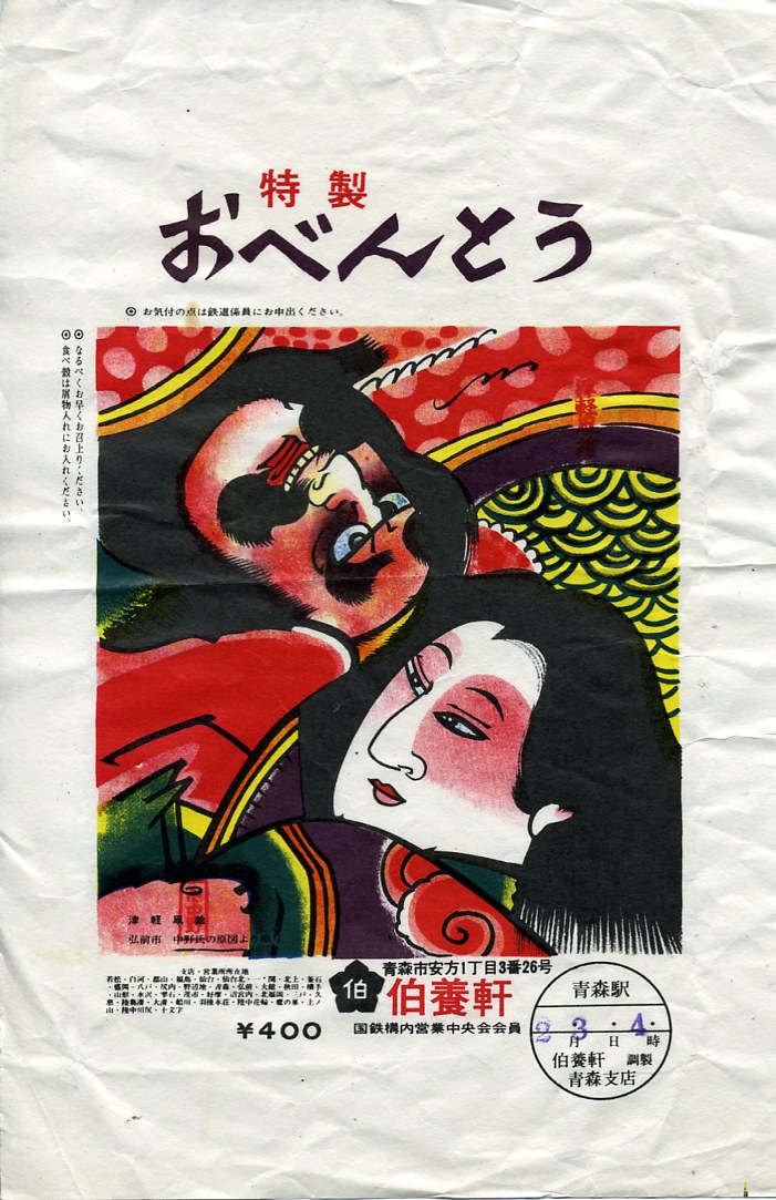 昭和40年代のものと思われる、昔の青森駅弁の掛紙。その絵柄に地域の特徴がなく、調製元も東北各地に支店を置いていたため、右下の「青森駅構内」の文字がなければ、販売駅さえも特定できないところだった。