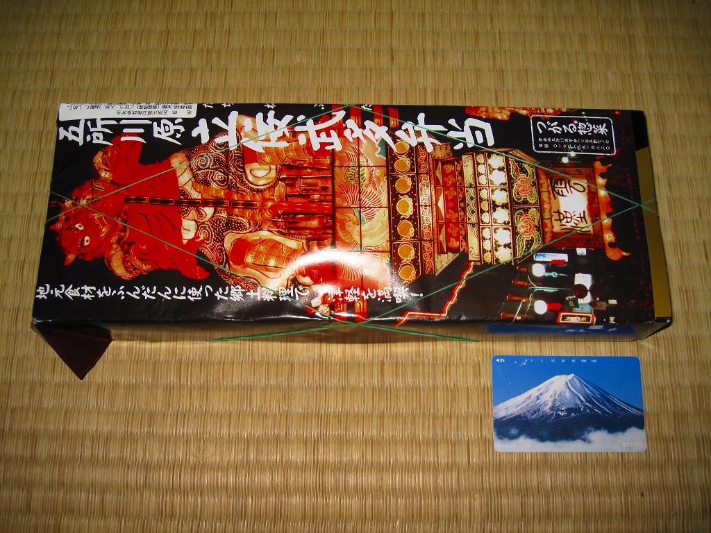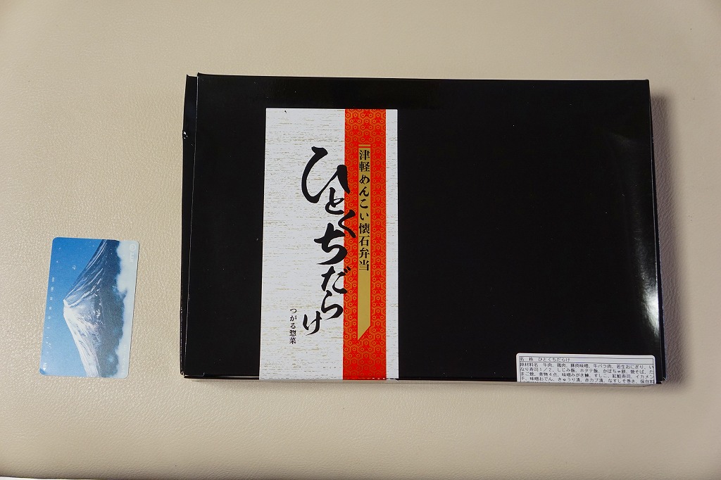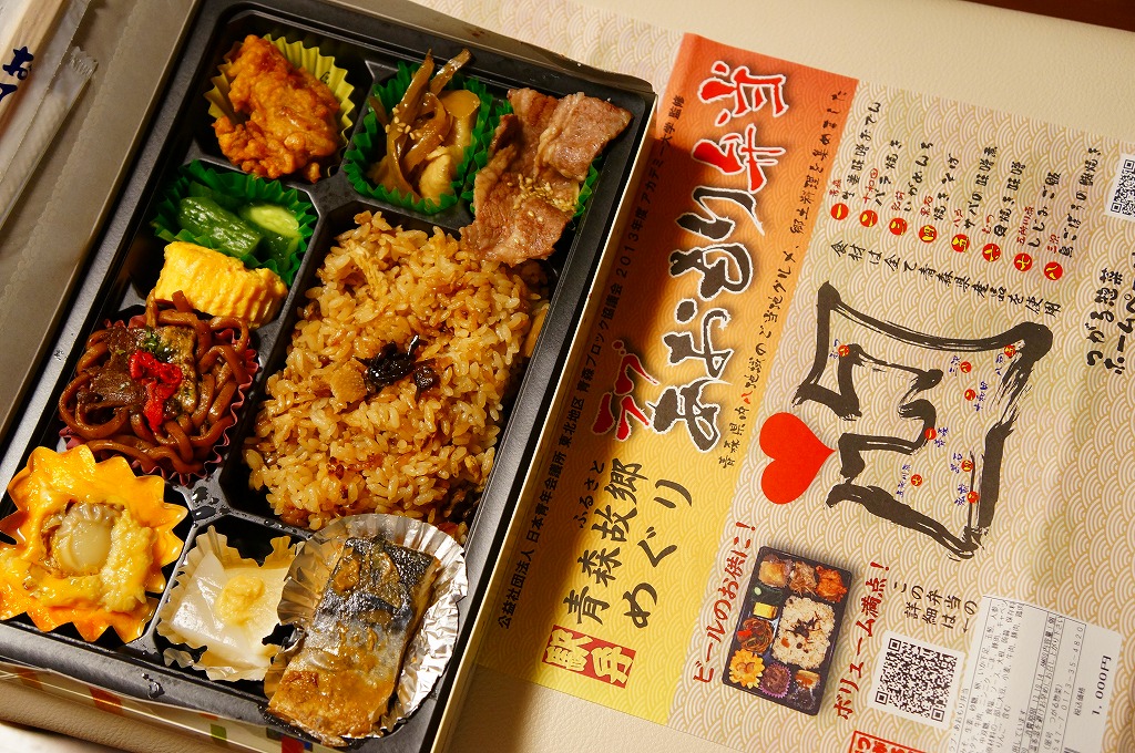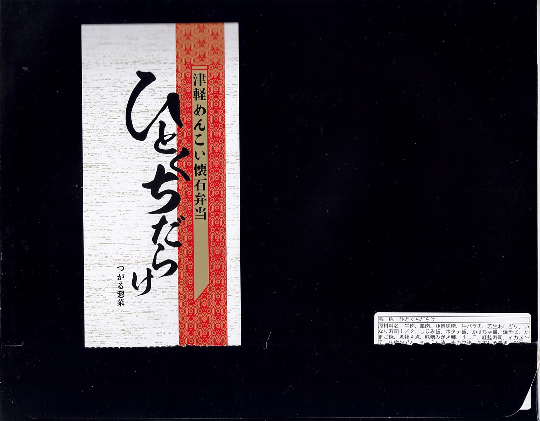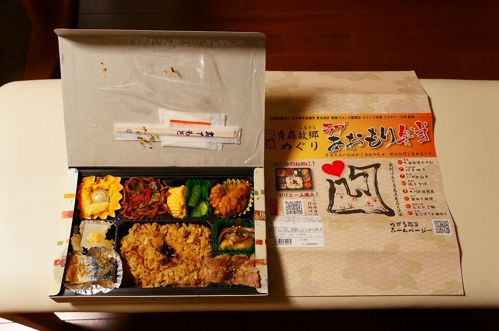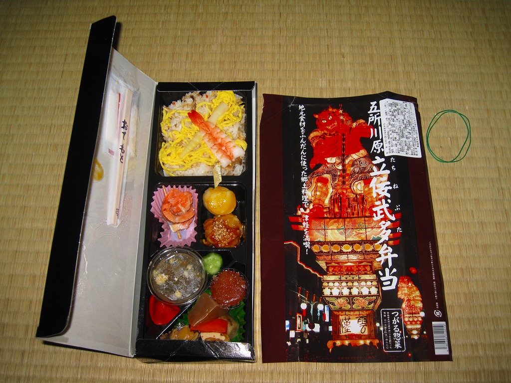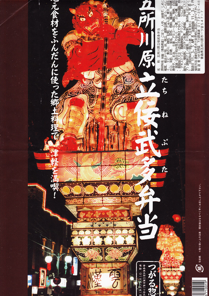 2010(平成22)年12月4日の東北新幹線新青森延伸と同日からの東京駅「新青森開業記念駅弁大会」に向けてデビューか。横あるいは縦に33センチもある、とても長い市販の仕出し弁当用ボール紙製容器を使用、五所川原の立佞武多の写真をまるまる掲載した掛紙を巻く。黒いプラ製トレーに収まる中身は、ボイルエビと姫竹が載る五目飯に、ホタテと鶏肉の串、サケの串、ホタテやニンジンやこんにゃくなどの煮物、じゅんさいゼリー、赤カブ、りんご煮など。「地元食材をふんだんに使った郷土料理」は見栄えも味も渋めなので、宣伝文か解説文が欲しいところ。