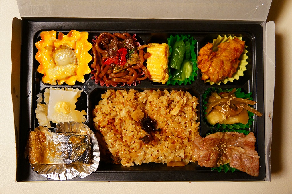 青森県内8地域のご当地グルメを詰めたという中身は、青森市の生姜味噌おでん、十和田市のバラ焼き、弘前市のいがめんち、黒石市の焼きそば、八戸市のサバの味噌煮、むつ市の貝焼き味噌、五所川原市のしじみご飯、三沢市の鳥ごぼうの鍬焼き、玉子焼、きゅうり。たしかに、昨今のB級グルメブームに乗ろうと、該当の各地で宣伝を見掛けるものが、そのままここに詰まっている。そう知らずとも、この調製元の駅弁らしい巨大な惣菜容器と、各種の肉の存在感と強い味付けにより、本当にガツンとボリュームがある、これぞ漢弁当という感じの力強さを感じた。価格は2013年の発売時や購入時で1,000円、2017年9月から1,300円。2019年までの販売か。