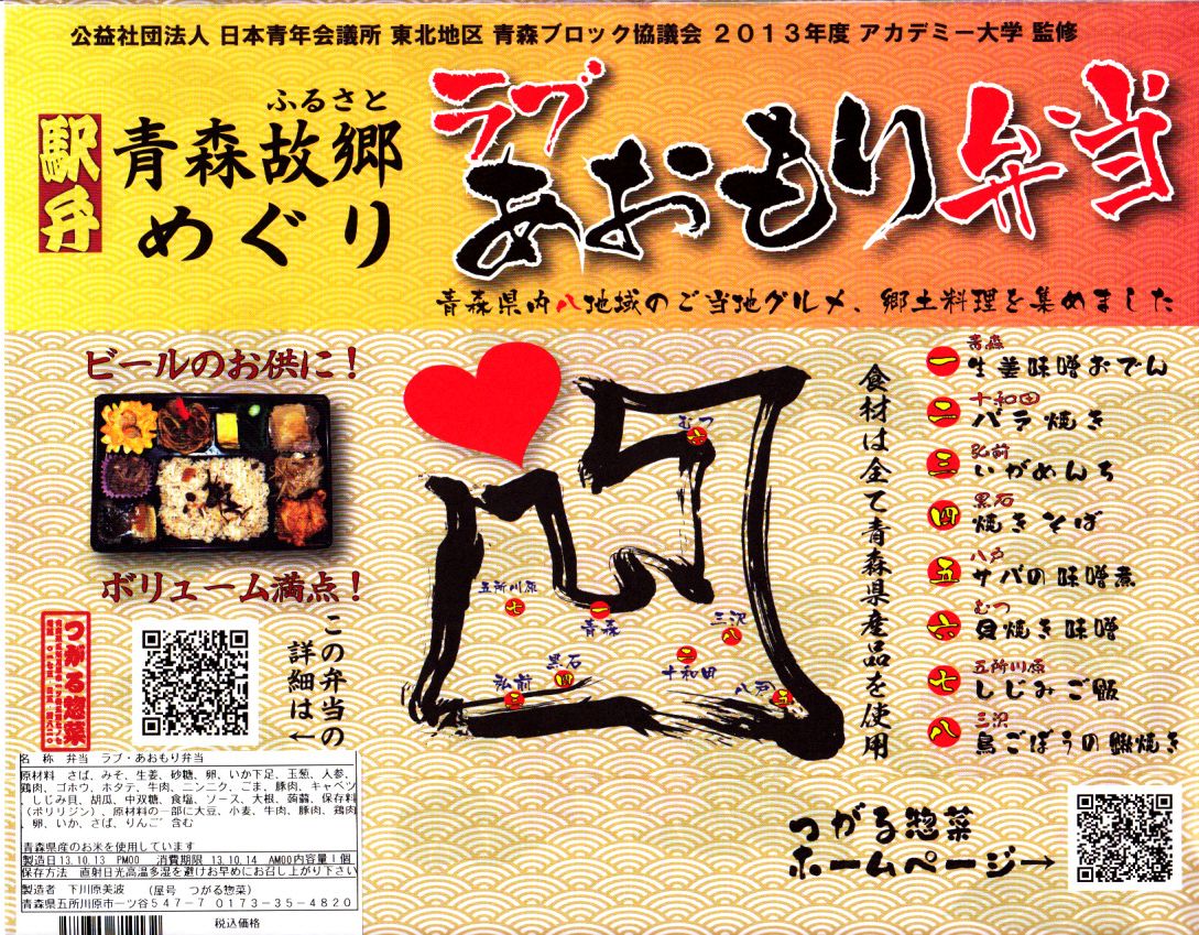 2013(平成25)年8月1日の発売。掛紙に書かれるとおり、公益社団法人日本青年会議所東北地区東北ブロック協議会の2013年度「アカデミー大学」で生まれたお弁当。調製元のつがる惣菜とのタイアップとも紹介される。