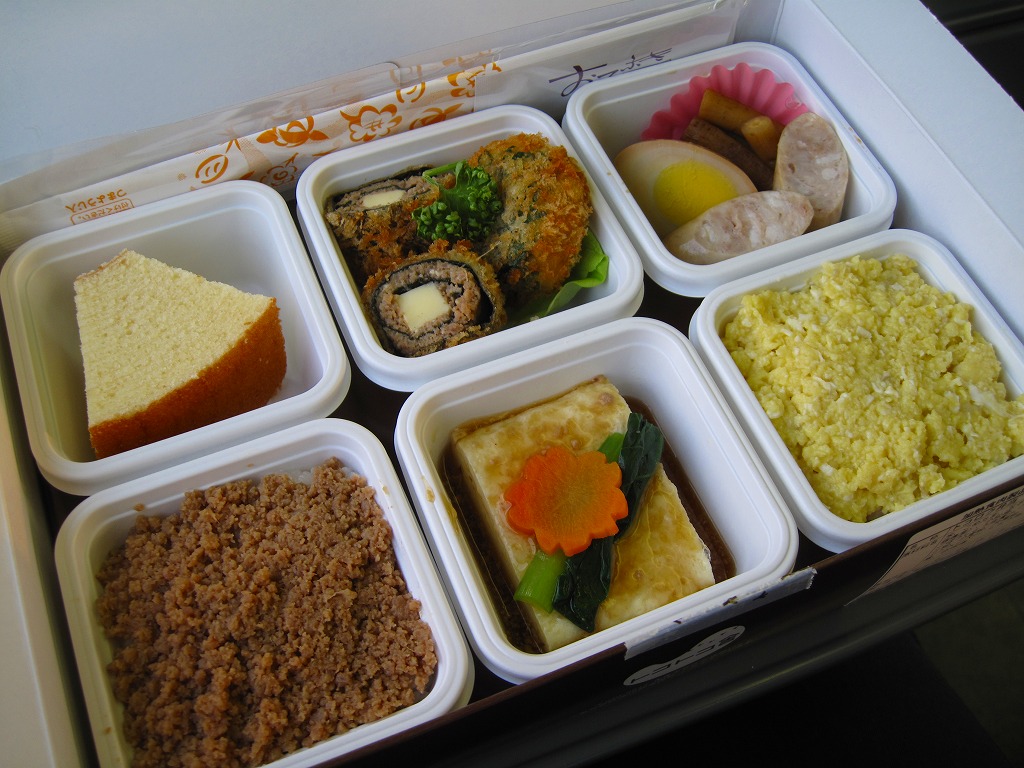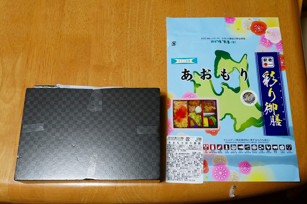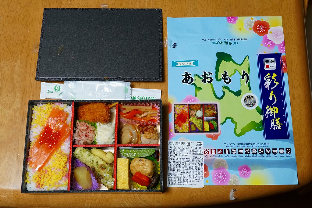 2010(平成22)年12月4日の東北新幹線新青森駅開業と同時に発売か。弁当名を描いた船用のボール紙箱を使用、6つの白いプラ製の惣菜容器に収まる中身はそれぞれ、鶏そぼろめし、玉子そぼろめし、豆腐のような玉子焼、チーズと鶏挽肉を大葉で巻いた揚げ物、ソーセージと煮玉子とごぼう、バームクーヘン。価格も見栄えも東京のデパ地下を目指したような、高くておしゃれな内容だと思う。食品表示ラベルには1,200円とあるが、現地では1,050円で掲示し販売されていた。一年間ほどの販売か。
