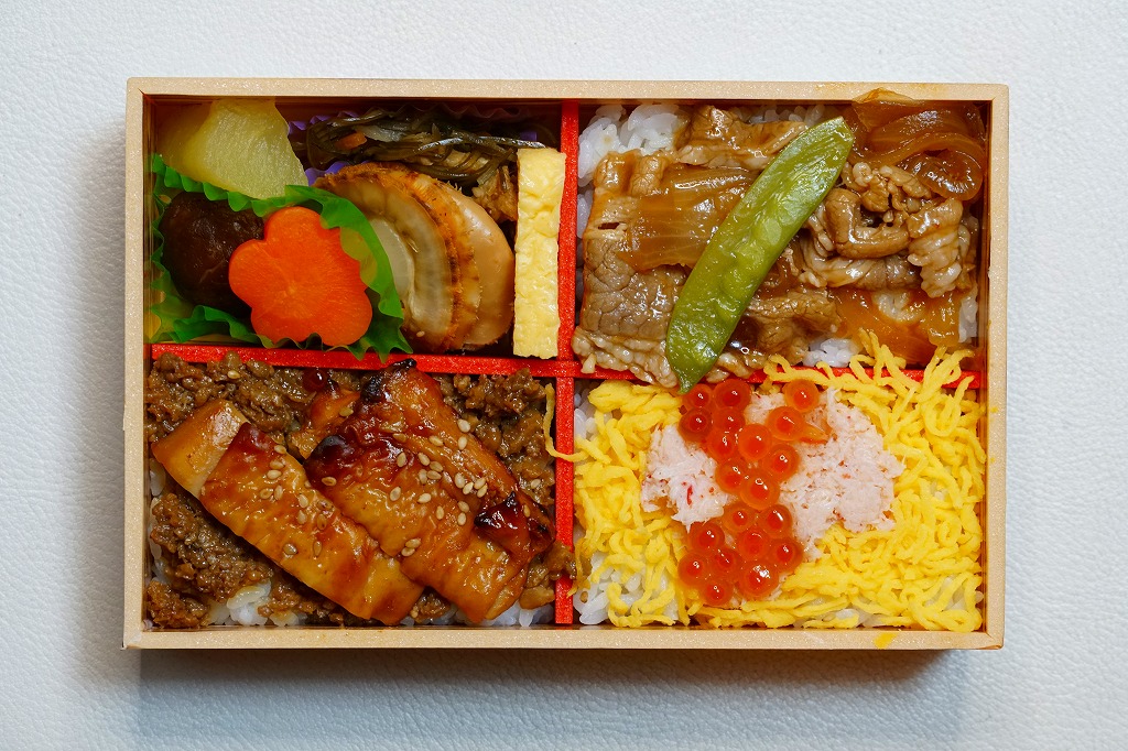 これまで青森で発売されている駅弁の中から人気のメニューを集めたという中身は、白飯を鶏照焼と鶏そぼろで覆う鶏丼、白飯を牛バラ玉ねぎ炒めで覆う牛丼、白飯を錦糸卵で覆いカニほぐし身とイクラを載せたカニイクラ丼、ホタテに煮物に玉子焼に切り昆布煮にりんごシロップ漬を詰めたおかず。青森県産米「青天の霹靂(へきれき)」をたっぷり詰めた御飯弁当。1年間ほどの販売か。