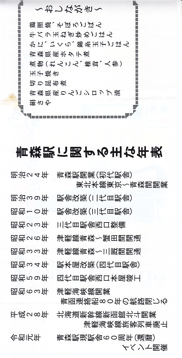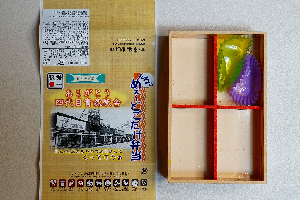 東京駅から東北新幹線はやぶさ号で3時間強。青森市は本州北部で陸奥湾に面した、人口約26万人の港町。明治時代に入り県庁が置かれ、帝都からの鉄道が開通して北海道への航路が拓かれたことで、県内一の都市として発展した。駅弁は新幹線の改札内や高架下のコンビニで売られるが、完売していることが多いと思う。1986(昭和61)年11月1日開業、青森県青森市大字石江字高間。