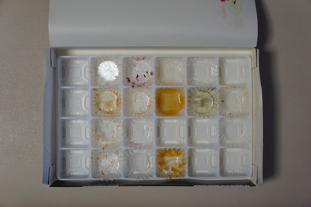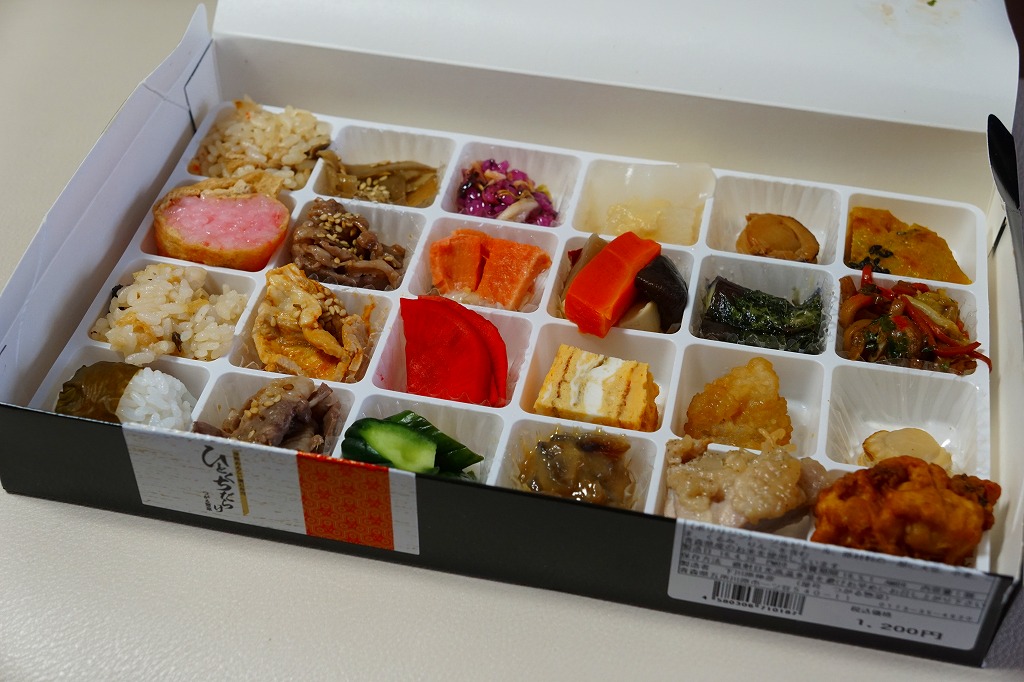 2016(平成28)年2月1日に東京駅と大宮駅で発売か。中身は写真のとおり、ほたて飯、イナリ寿司、しじみ御飯、若生(わかおい:1年ものの昆布)おにぎり、くわ焼、牛バラ焼、豚みそ漬、牛源タレ焼、すしこ、鮭の飯寿司、赤カブ漬、きゅうり漬、味噌おでん、煮物4点、手作り卵焼き、菊のおひたし、煮ホタテ、茄子しそ巻き、ホタテ唐揚げ、鶏肉塩焼、カボチャ餅、黒石焼きそば、酢ホタテ、イカメンチと、実に24種類ものメニューが、高級チョコ大の区画に収まる。アイデアとしてありきたりでも、商品化と東京への輸送は驚くべき。食べて疲れを覚えそうなレベルの、究極のおつまみ駅弁かもしれない。価格は2016年の発売時や購入時で1,200円、2017年9月から1,350円、2025年時点で1,500円。