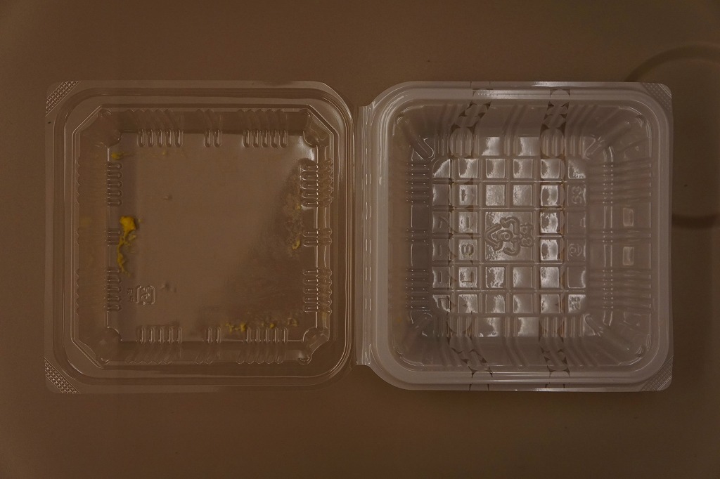 北海道新幹線の一番列車の車内で買えたサンドイッチ。食パン四等分サイズの、正方形のタマゴサンドとハムレタスサンドが、四方を向いてプラ製のサンドイッチ向け容器に収まる。国内の列車の車内販売で買えたサンドイッチとしては、経験上日本一の安さ。調製元は新幹線新青森駅の開業の頃からの駅弁屋。