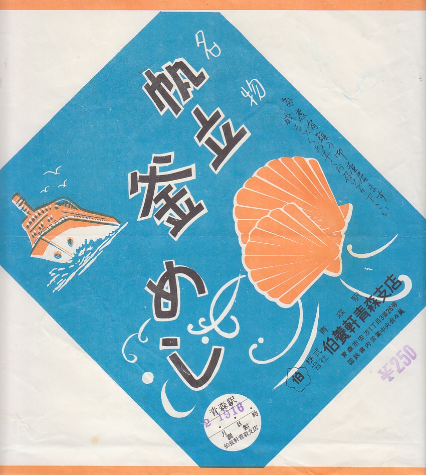 1960年代の、8月8日9時の調製と思われる、昔の青森駅弁の掛紙。船とホタテの絵柄は下記のものと同じだが、青函連絡船の形が近代的なものに変わっており、これは1964年からの津軽丸型か。