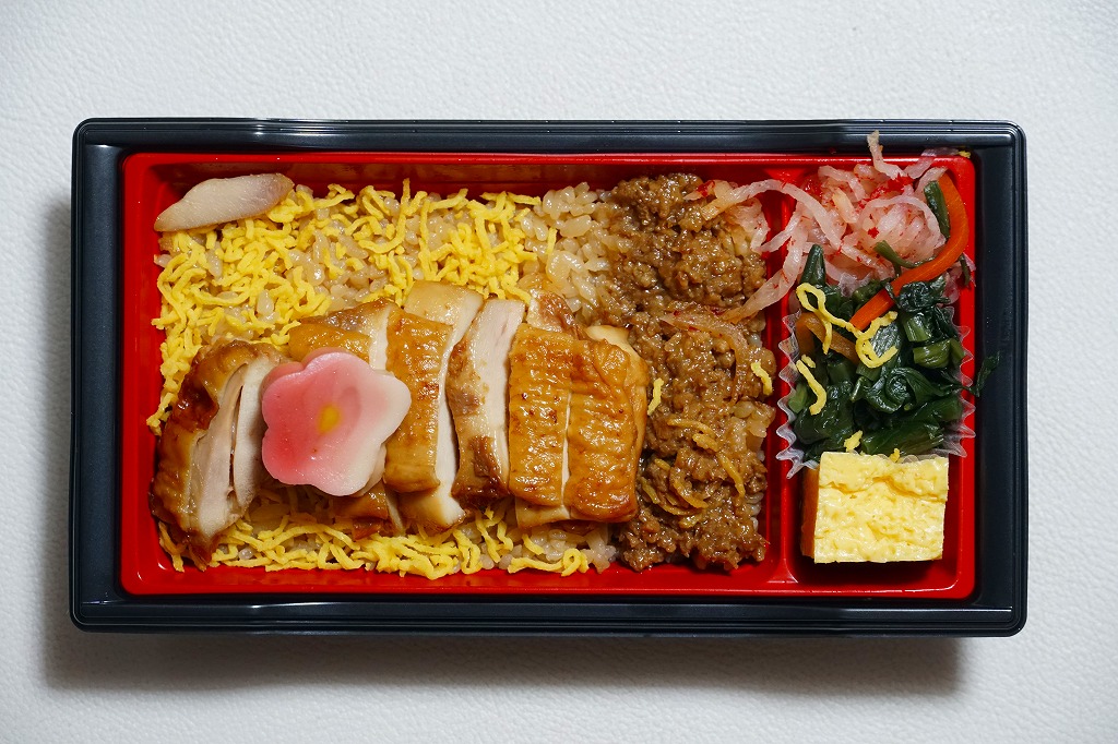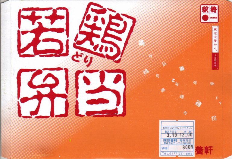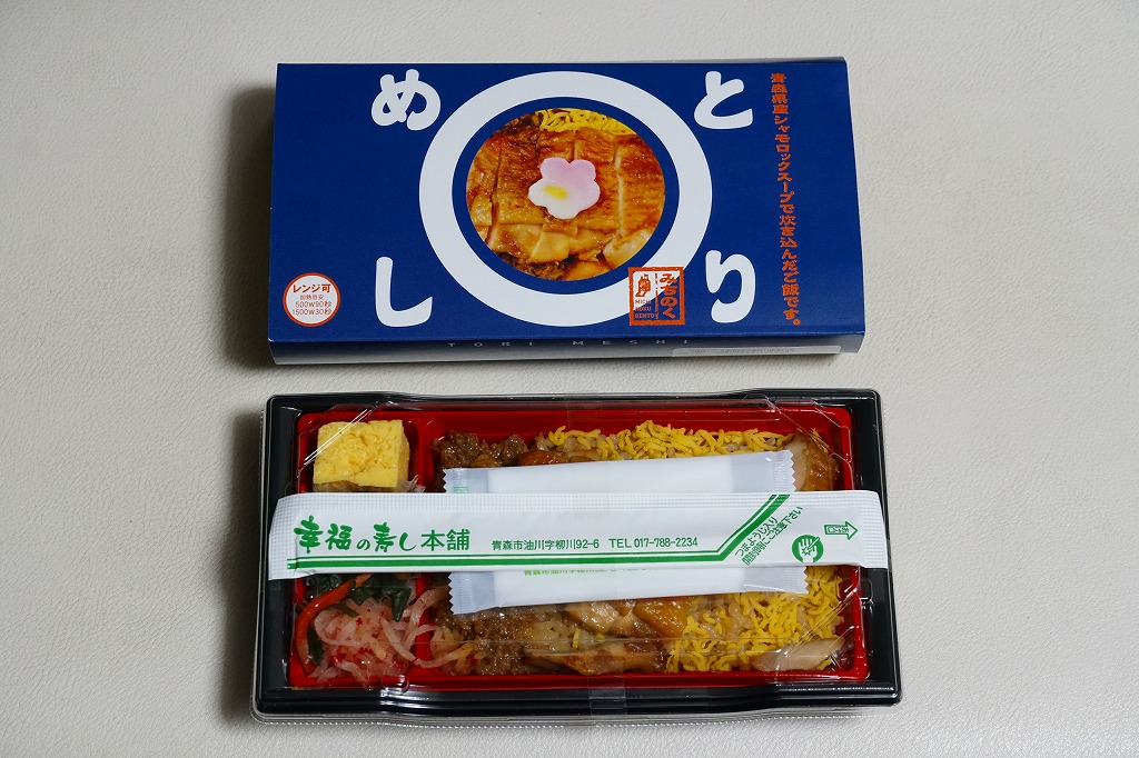四角いプラ容器を収める青いスリーブに、商品名と円形の中身写真を記す姿は、それらのすべてに共通する。中身は、青森県産シャモロックの鶏ガラスープで炊いたという醤油飯を、錦糸卵と鶏照焼と鶏そぼろで覆い、玉子焼とわさび菜と大根漬を添えるもの。調製元は新青森駅の駅弁屋で、青森にちなむ食材が使われるようだが、青森の雰囲気が感じられない、だから岩手で買えても違和感のない、属地性不詳なお弁当。
