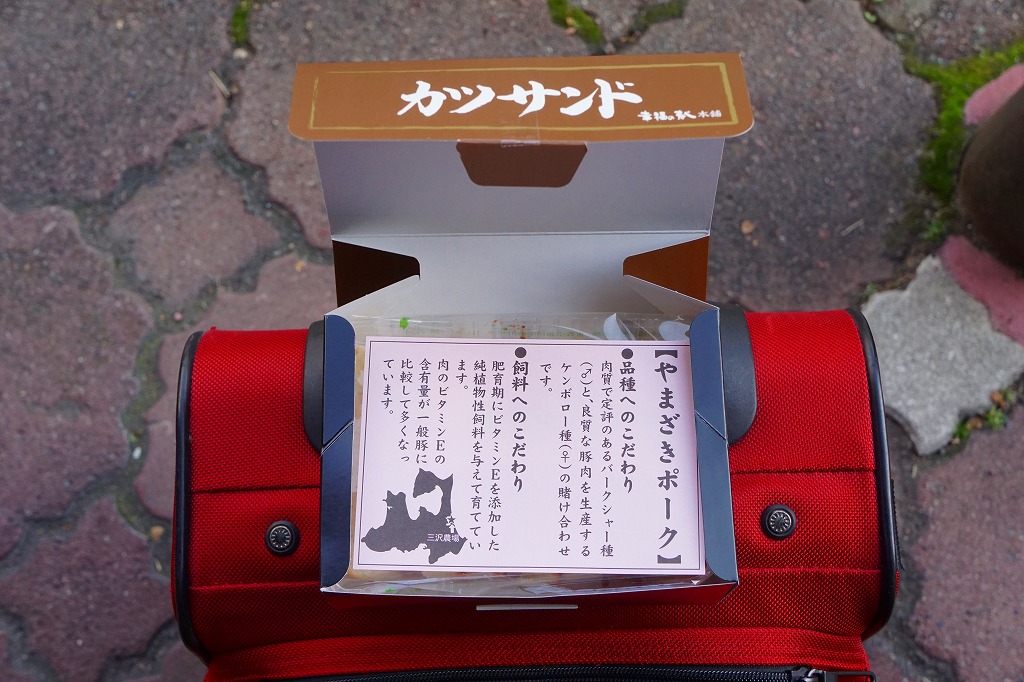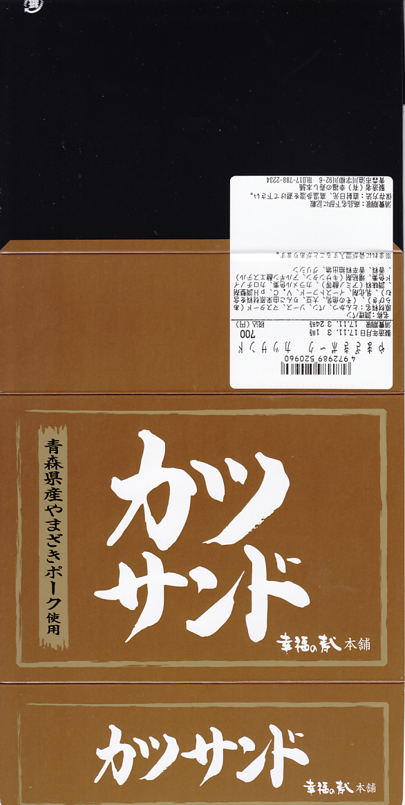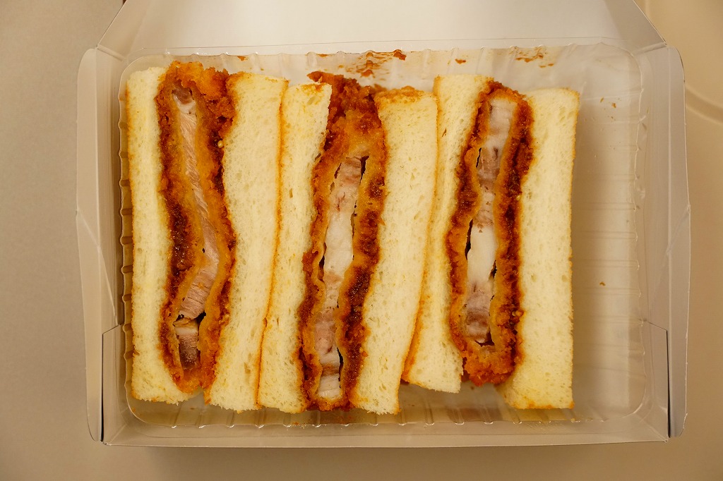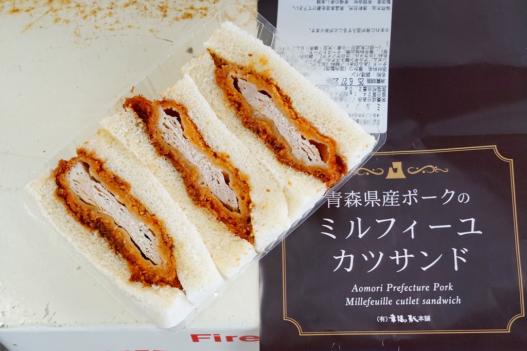 商品名は「やまざきポークカツサンド」とも。茶色い紙箱に直接、衣が厚くしっかりした、青森県産やまざきポーク使用というソース漬けのロースカツを、軽くトーストした厚めの食パンに挟んだサンドイッチを、3切れ詰める。歯応えしっかり、クセはなく、都会的においしくいただけた。2025年3月24日で終売し、翌日に「青森県産ポークのミルフィーユカツサンド」を発売。