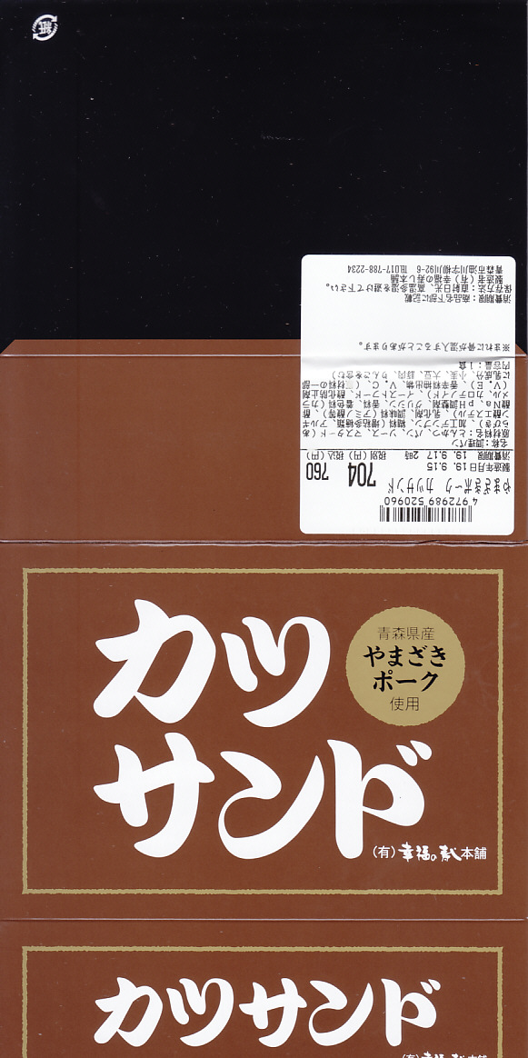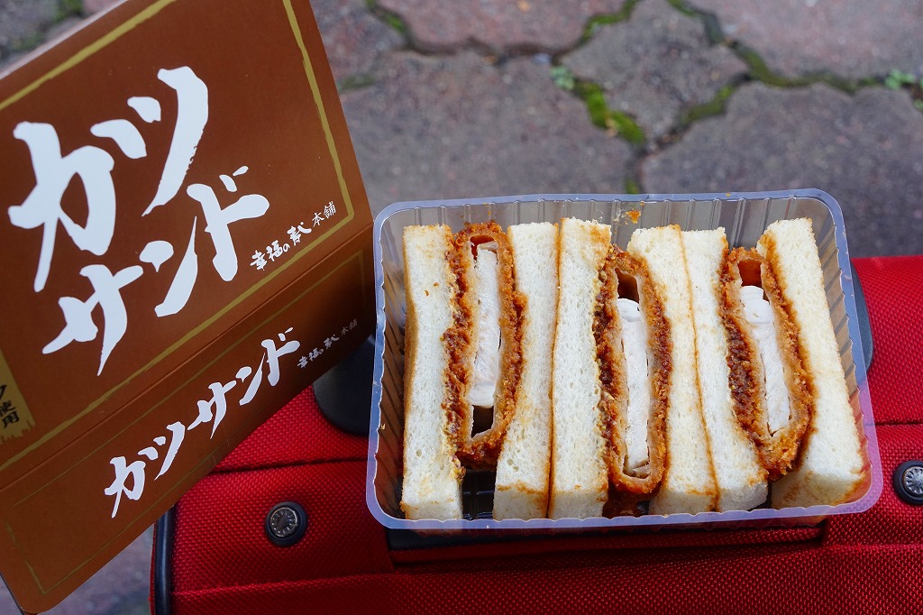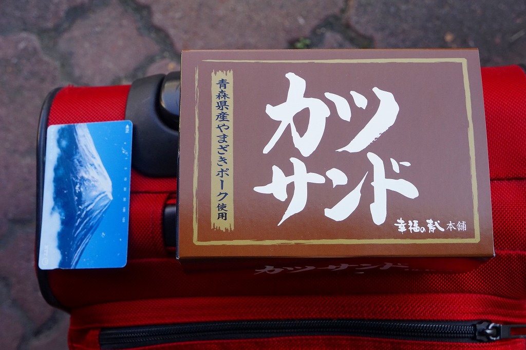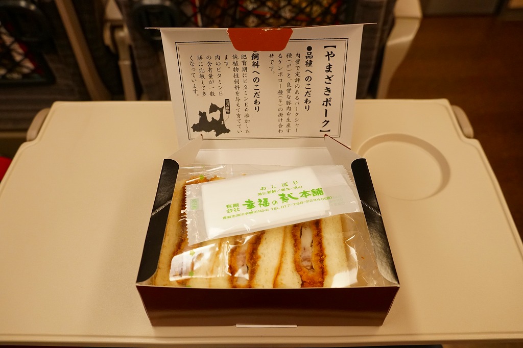2025(令和7)年3月25日に新青森駅などで発売。下記の商品「カツサンド」をリニューアル。薄いプラ製トレーに、青森県産ポークの薄切りを重ねて揚げたトンカツのソース付けを耳なし食パンに挟んだカツサンドを3切れ詰め、袋詰めして掛紙を巻いた。包装が簡易になっても、掛紙に巻かれるので駅弁のようにみえる。味は変わらなくても、お肉の形が違うのでより柔らかい感じ。価格は190円もアップ。