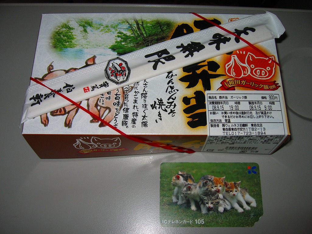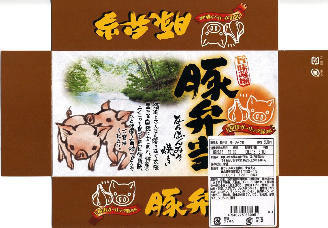 2007(平成19)年の夏までに発売か。深めの赤い容器にかかるボール紙のフタには、商品名と豚と奥入瀬かどこかの清流が印刷される。中身は白御飯の上に十和田ガーリック豚を使用したという大きな豚肉南蛮味噌焼が1枚載り、ニンジンときぬさやで彩り、きんぴらとリンゴ甘煮とさくらんぼを添えるもの。