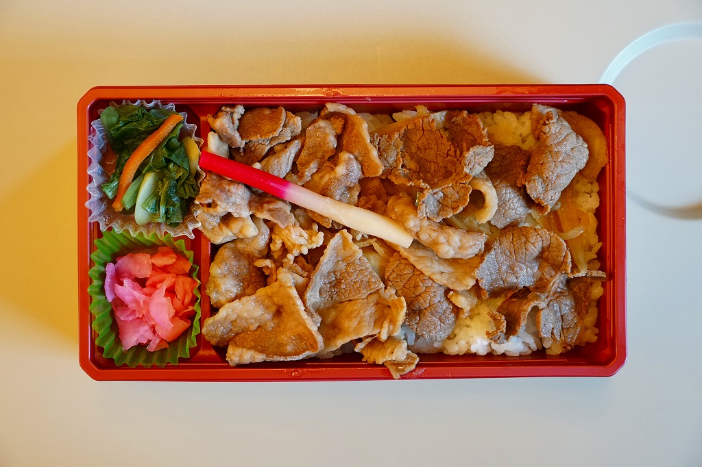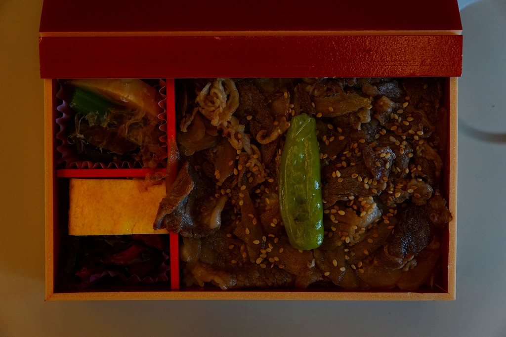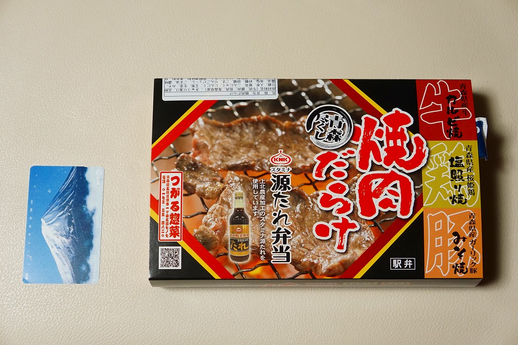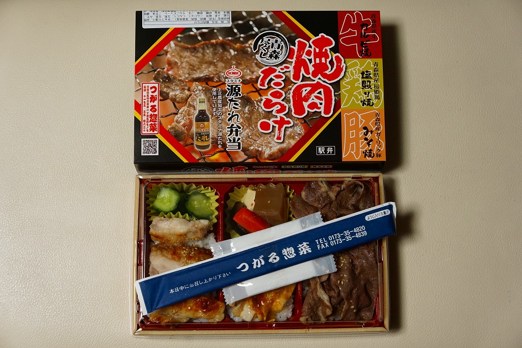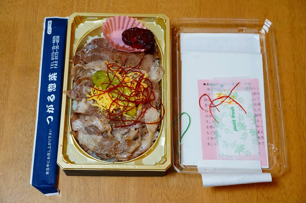 コンビニ弁当並みに浅く平たいプラ容器に白飯を詰め、小川原湖牛の焼きしゃぶという牛焼肉で覆い、錦糸卵とししとうと糸唐辛子で彩り、リンゴのしそ巻き酢漬を添える。味付けのない肉の味はB級に力強く、つがる惣菜の駅弁らしい感じ。2022年までの販売か。