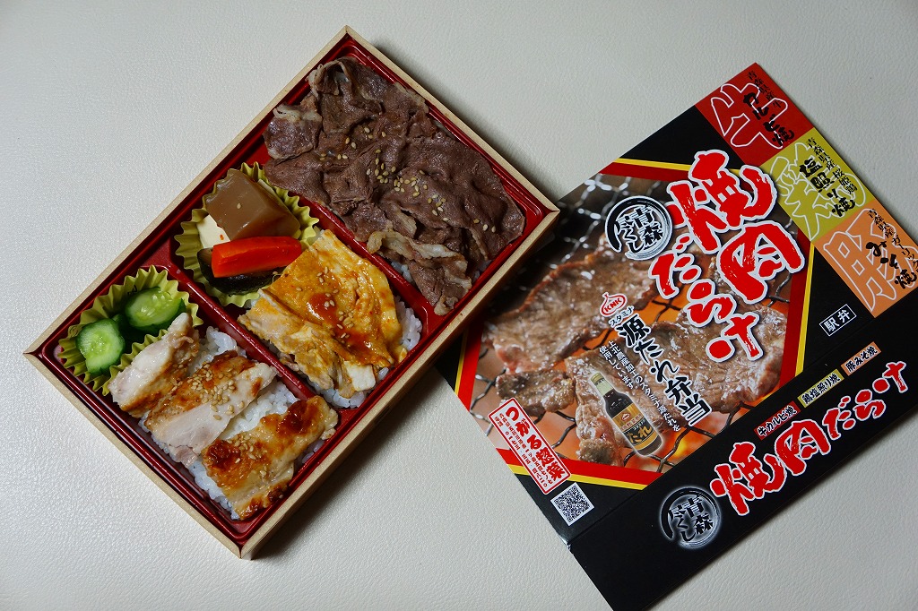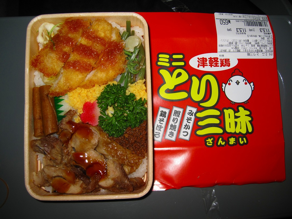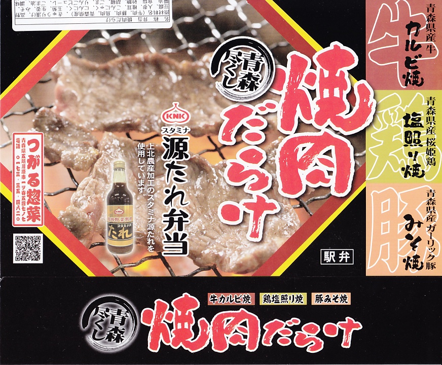2013(平成25)年の夏までに発売か。スリーブに記されるとおり、青森県産牛のカルビ焼、青森県産桜姫鳥の塩照り焼、青森県産ガーリック豚のみそ焼が、それぞれ1区画ずつ丼ものになっている、牛と鶏と豚の肉駅弁。味付けに青森が誇る焼肉のたれ「スタミナ源たれ」を使用したという。