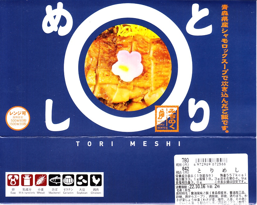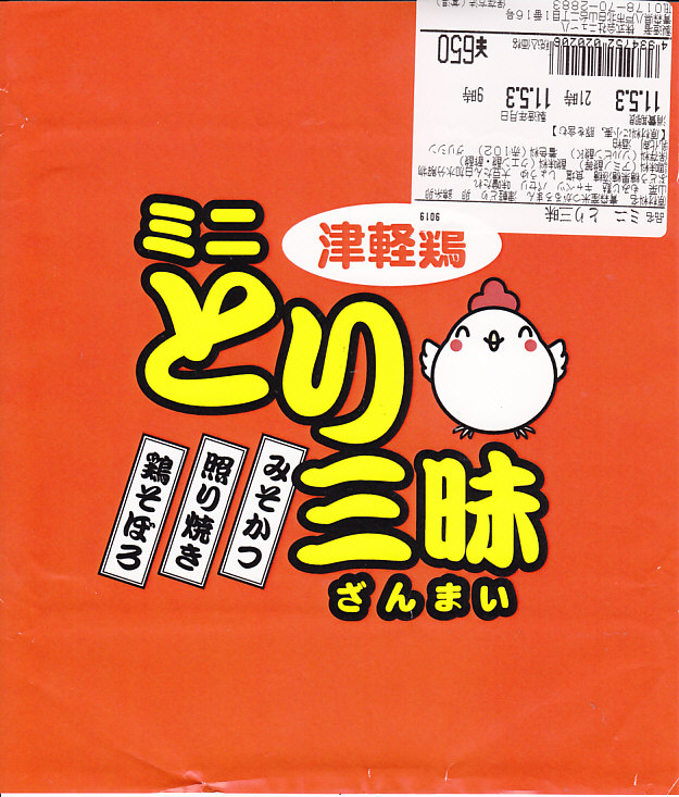 2010(平成22)年12月4日の東北新幹線新青森駅開業に合わせて、新青森駅で発売か。小柄な長方形の容器に透明なふたをして、商品名とニワトリを描いた赤い掛紙をかける。中身は白御飯の上に鶏照焼、味噌ソースをかけた鶏カツ、鶏肉そぼろに玉子そぼろ、ごぼう、山菜、パセリを載せるもの。小さい箱に賑やかな鶏が詰まる、移動中の機能的な軽食として最上の価格と内容を備えると思う。これの「ミニ」が付かない商品は見たことがない。
