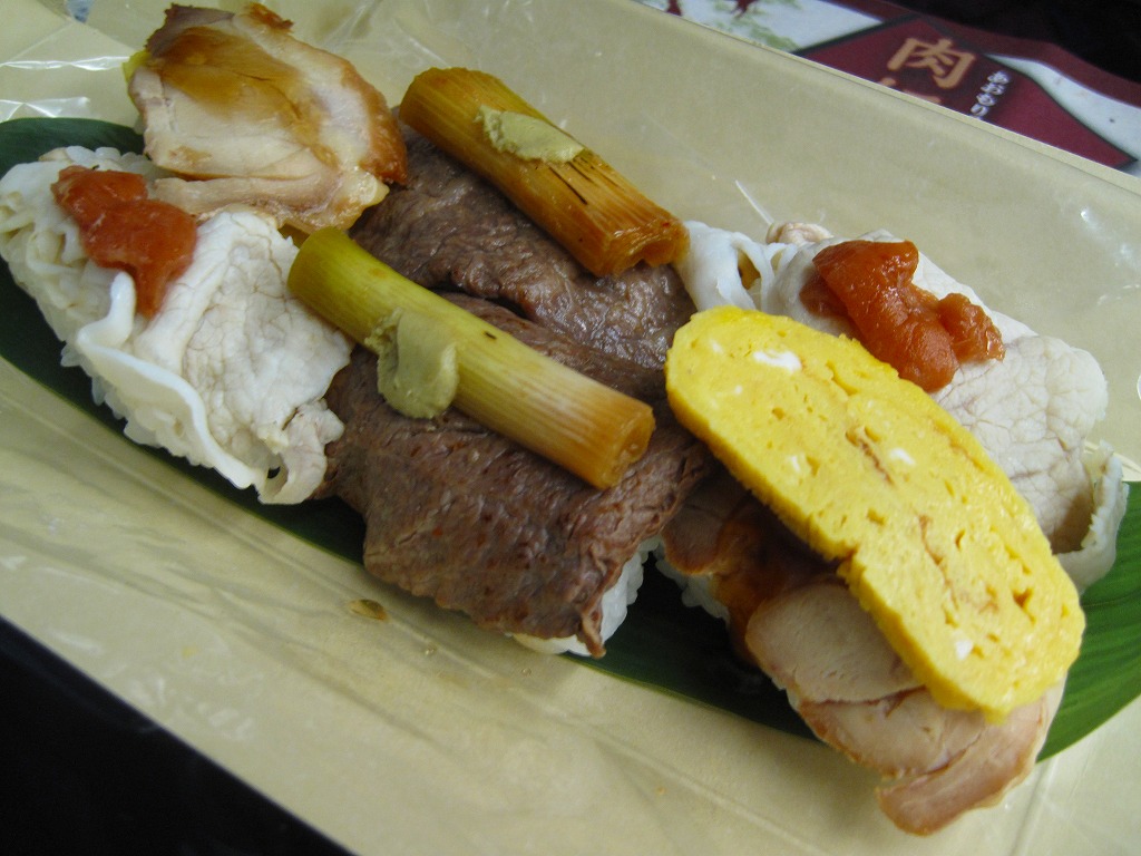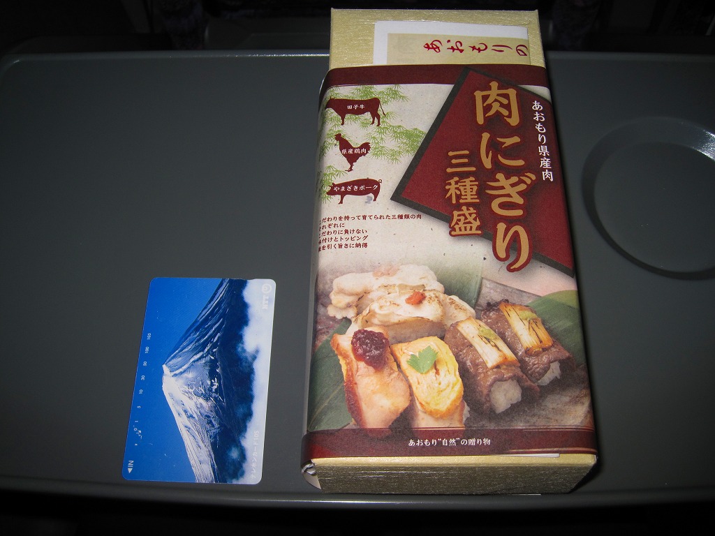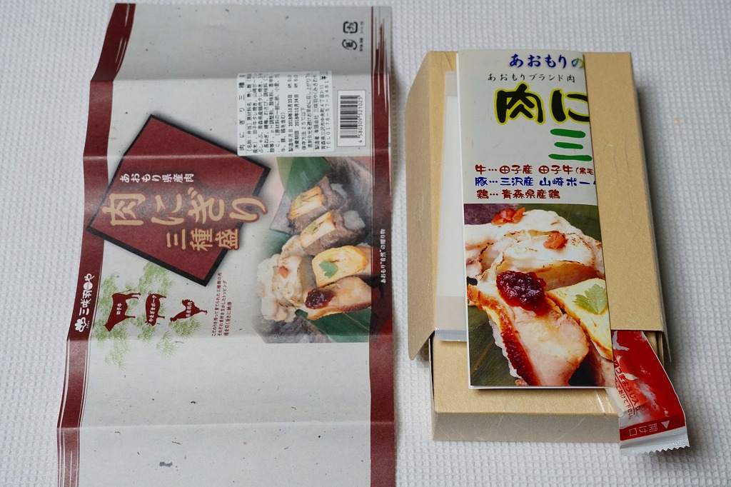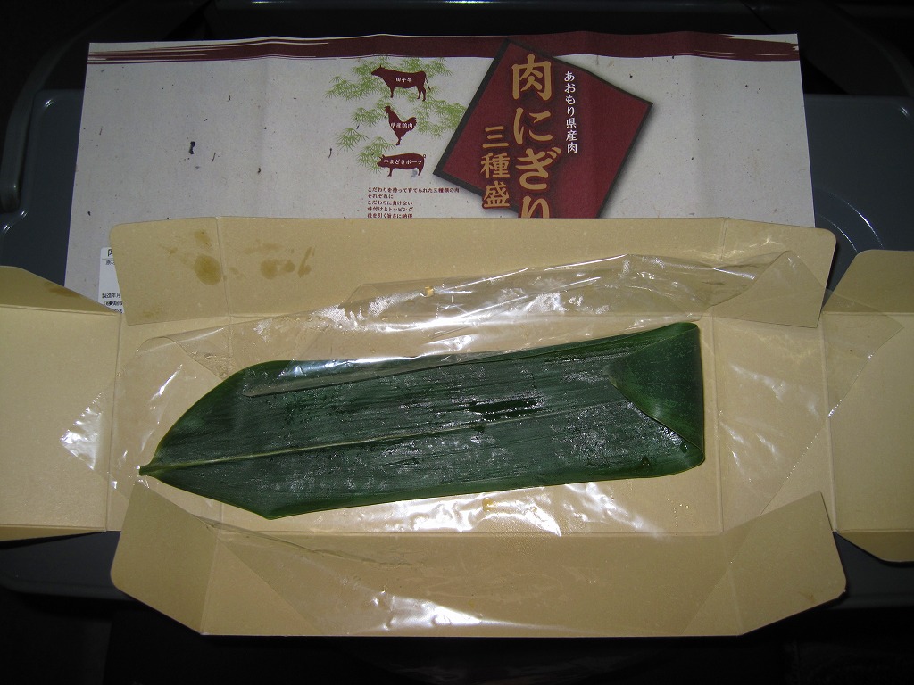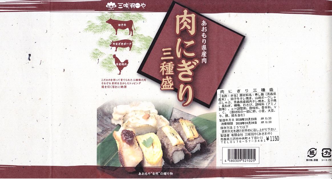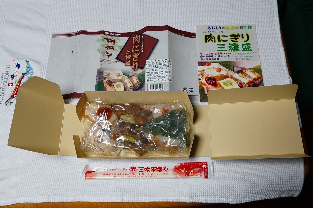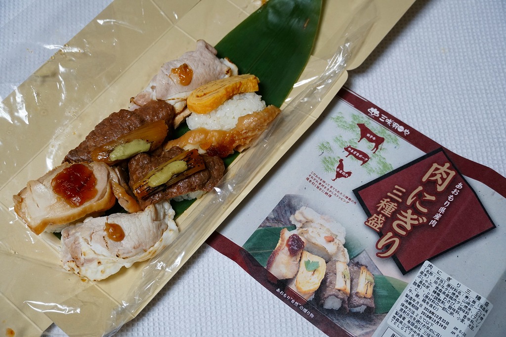 2010(平成22)年12月4日の東北新幹線全線開業に向けて開発し、新青森駅などで発売か。和紙風の表面加工をしたボール紙の容器に、中身の写真と商品名などを印刷した掛紙を巻く。中身は焼ネギとワサビを載せた田子牛の牛焼肉、玉子焼を載せた県産鶏肉の鶏照焼、梅肉ソースを載せたやまざきポークの豚しゃぶを、それぞれ握り飯と合わせたもの。にぎり寿司のようで食べやすく、肉はうまく、創作料理の雰囲気を程良く感じる。価格は2018年の購入時で1,150円、2020年時点で1,300円、2024年時点で1,350円、2025年時点で1,490円。