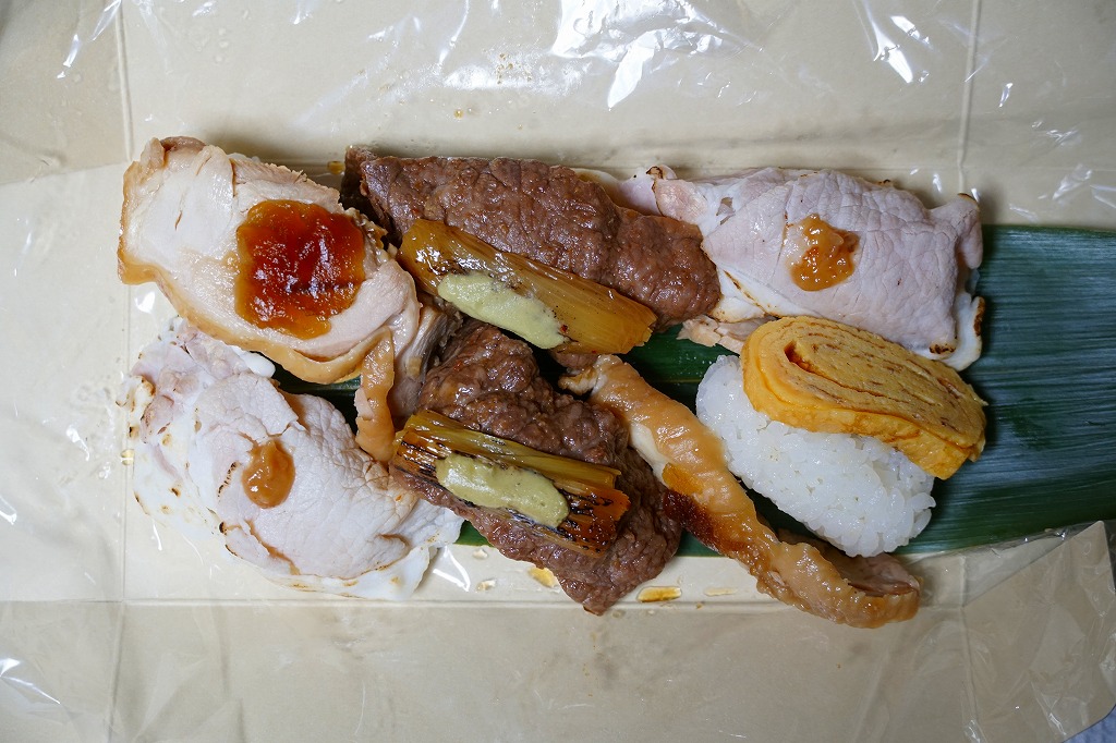 赤黒く飯からはみ出るパワフルな牛、厚さと適度な固さとしっかりした塩味がある鶏、少量のはずが厚さと脂肪の質が噛み切るのに絶妙で飯を余さない豚と、力強い内容に感じた。今回は東京駅で購入したが、輸送販売の肉駅弁にありがちな寂しさはどこにもない。価格は2016年の購入時で1,100円、2018年時点で1,300円。2019年までの販売か。