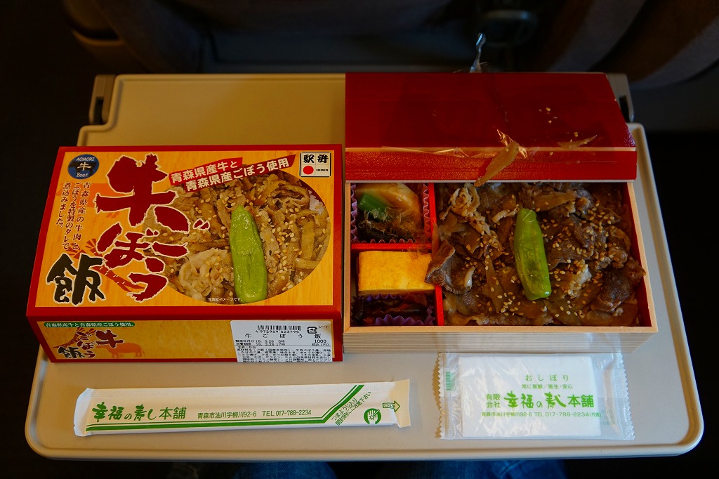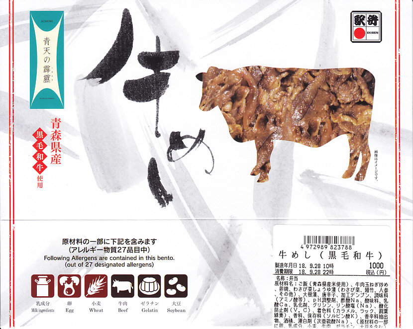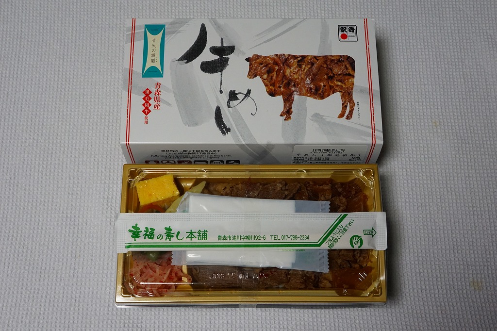 2018(平成30)年の夏頃の発売か。駅弁の名前は「青森県産黒毛和牛牛めし」とも。同じ頃に出た「青天の霹靂米日記」と同じく、青森県のブランド米「青天の霹靂(せいてんのへきれき)」を使用、その白御飯を青森県産の黒毛和牛のタマネギ炒めで覆い、唐辛子を刻み、玉子焼、わさび菜、大根漬を添える。青森づくしの牛丼のはずが、パッケージでの紹介や宣伝を含め、米と牛の味が出ていない印象。牛すき焼丼というよりはむしろ牛しぐれ丼だった。価格は2018年の発売時や購入時で1,000円、2020年時点で1,080円、2022年3月から1,200円、2024年11月から1,500円。