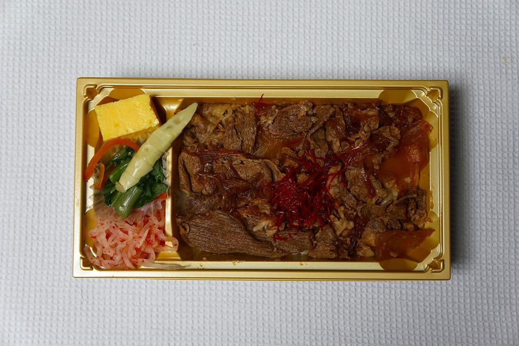 2016(平成28)年の年明け頃に発売か。白御飯の上を牛肉煮とゴボウ煮で覆い、ししとうで彩り、玉子焼、タケノコやフキなどの煮物、キュウリの漬物を添える。見た目も内容も味も一般的な牛丼駅弁。オール発泡材製の容器のふたが、めくり上げるような構造で、本体と分離しないつくりが特徴に見える。年内で終売か。