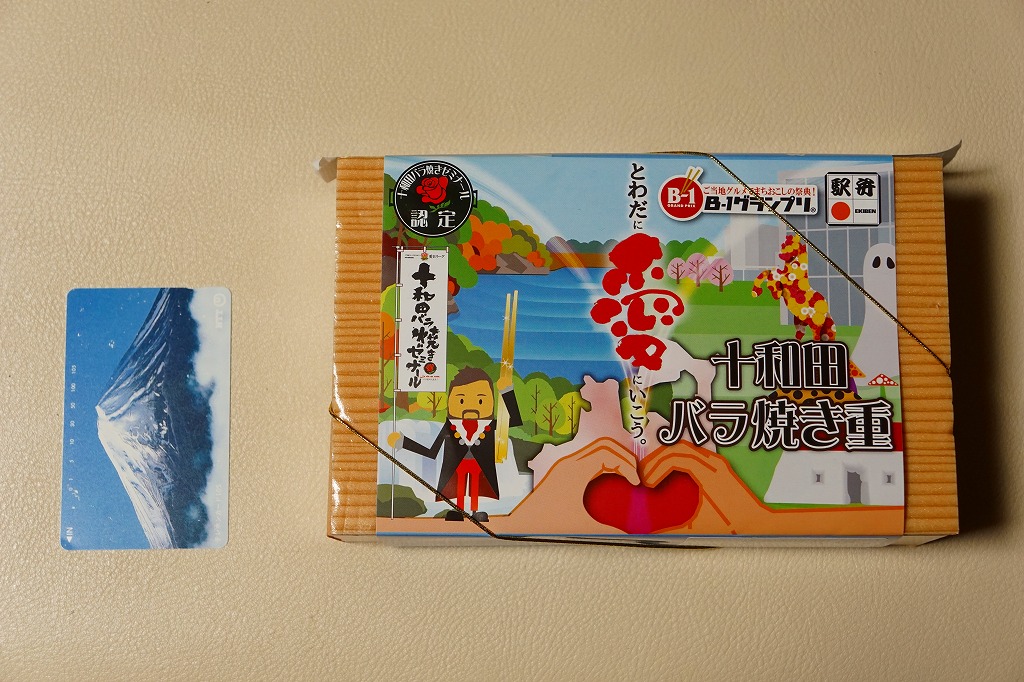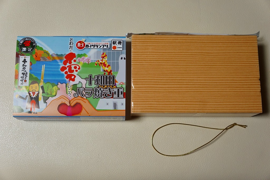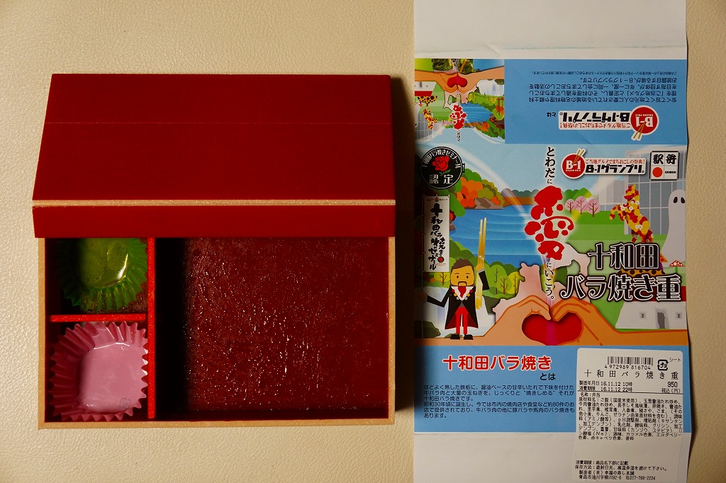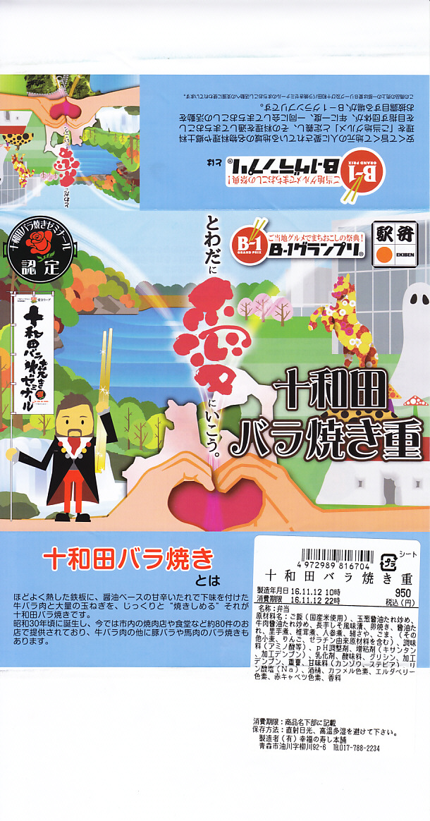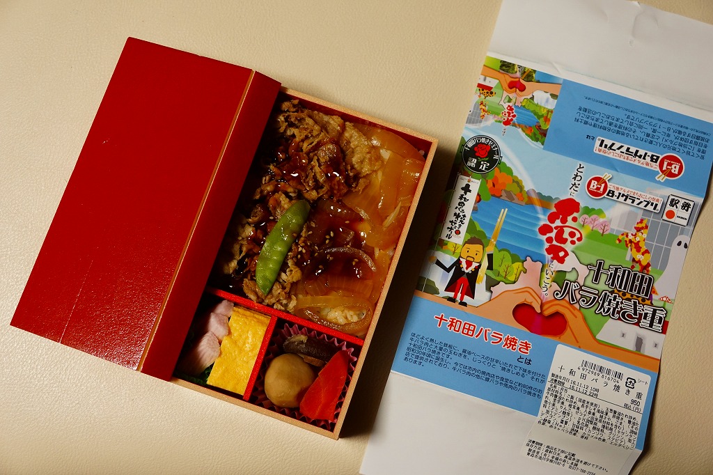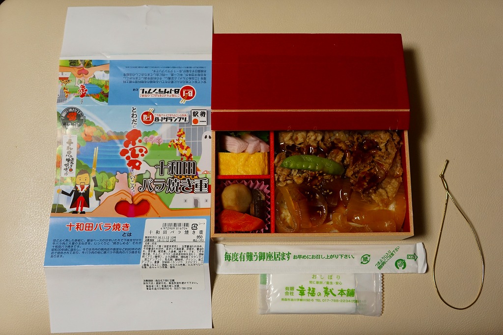 2013(平成25)年11月11日に新青森、八戸、盛岡の各駅と東北新幹線車内で発売。掛紙で読めるとおり、「B−1グランプリ」にエントリーされた青森県内の炒め物「十和田バラ焼き」の駅弁。ふたを外すのでなくめくる構造の容器を使用、中身は白御飯を牛肉炒めとタマネギ炒めで覆い、タレときぬさやで彩り、煮物、玉子焼、ナガイモを添えるもの。量も質もそんなにあるわけでない牛肉に、タレとタマネギを合わせると、なんかうまい感じ。どこかの淋しいブランド牛駅弁より満足できる。価格は2013年の発売時で900円、2016年の購入時で950円、2019年時点で1,000円、2020年時点で1,080円、2022年3月から1,200円、2024年11月から1,500円。