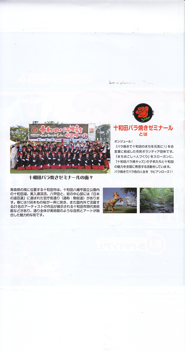 十和田バラ焼きは2009(平成21)年の組織化。2006(平成18)年2月の青森県八戸での第1回開催が成功し、グランプリの富士宮やきそばや厚木シロコロホルモンが大人気となったイベント「B−1グランプリ」へのエントリーへ向けて、由来と物語を付けて全国各地で生み出されたご当地グルメのひとつに見える。ここでは第二次大戦後まもなく現在の青森県十和田市街で、米軍払い下げの安い牛肉のバラ肉を美味く食べるために、タマネギとともにタレに絡めて鉄板で焼いて食べる調理方法が生み出されたとする。甲斐あって2014(平成26)年の第9回大会でグランプリを獲得した。