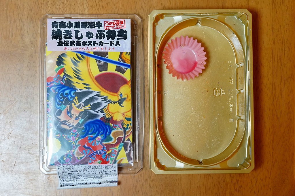 2020(令和2)年10月の発売は、同月からのJR東日本の駅弁キャンペーン「駅弁味の陣2020」へのエントリーに向けたものか。写真で掛紙に見えるものは、透明な袋に入った葉書大のカードで、2018(平成30)年に実際に使われた、五所川原の立佞武多の絵柄が描かれている。
