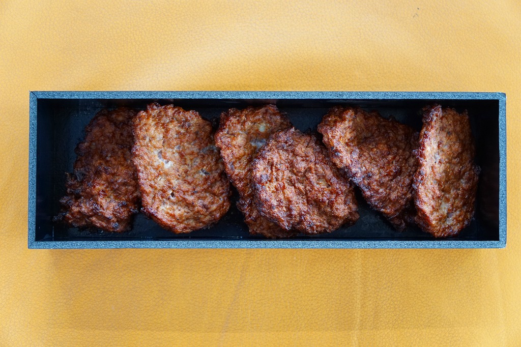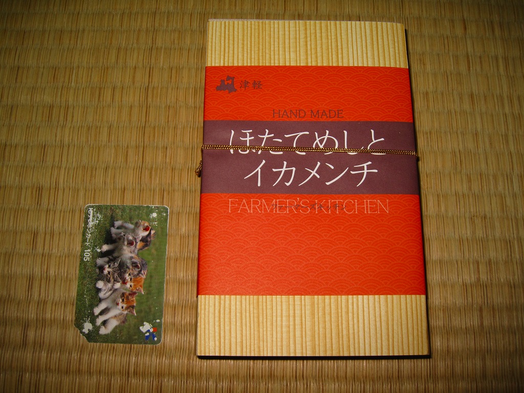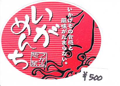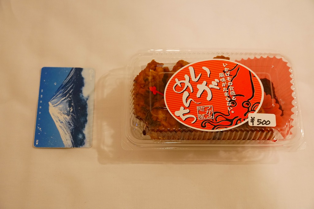 東北新幹線の新青森駅までの延伸開業を見据えて、2010(平成22)年8月までに勢揃いした「津軽弁」のひとつ。真っ黒でスリムな箱の中に、ハンバーグか薩摩揚のようなものだけが6枚収まる。これが津軽地方の郷土料理である、イカゲソとタマネギを小麦粉に混ぜた油揚げ「いかめんち」。お子様かおじさま向けのおやつ、あるいはお惣菜といった印象。2017年頃までの販売か。