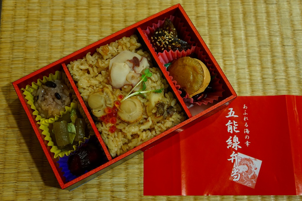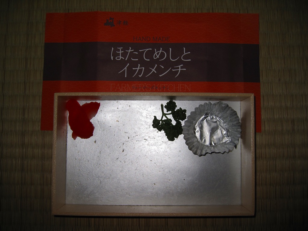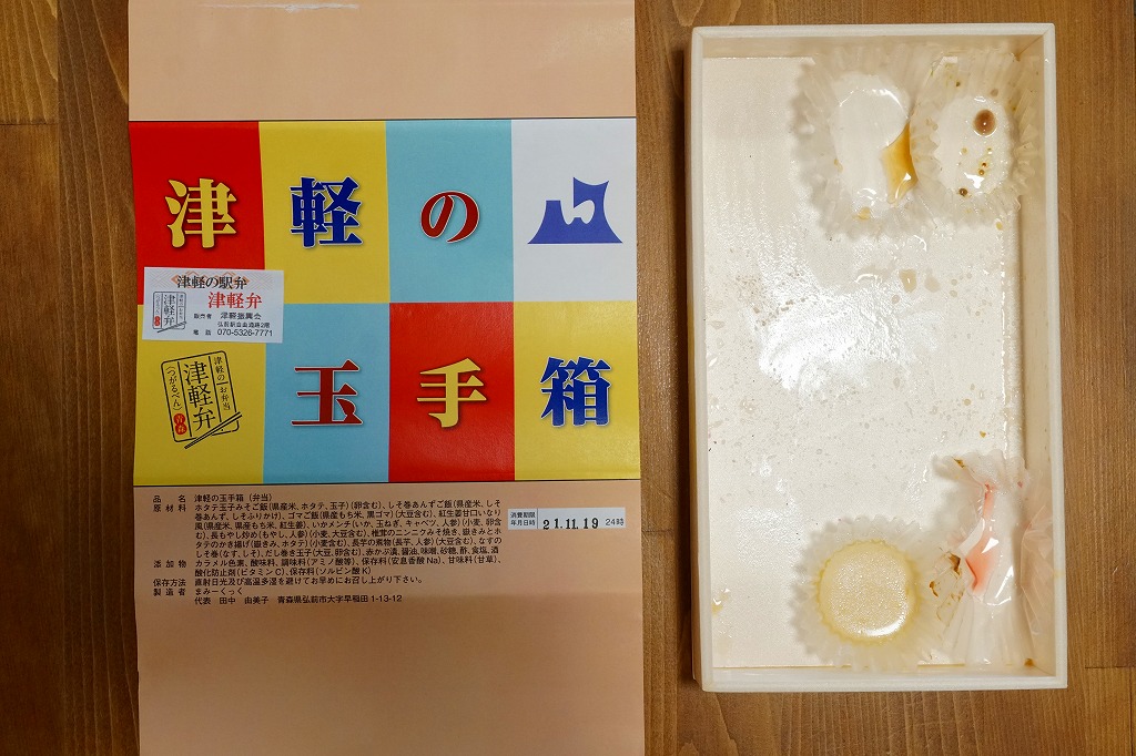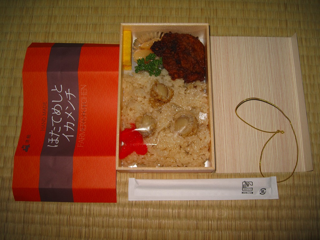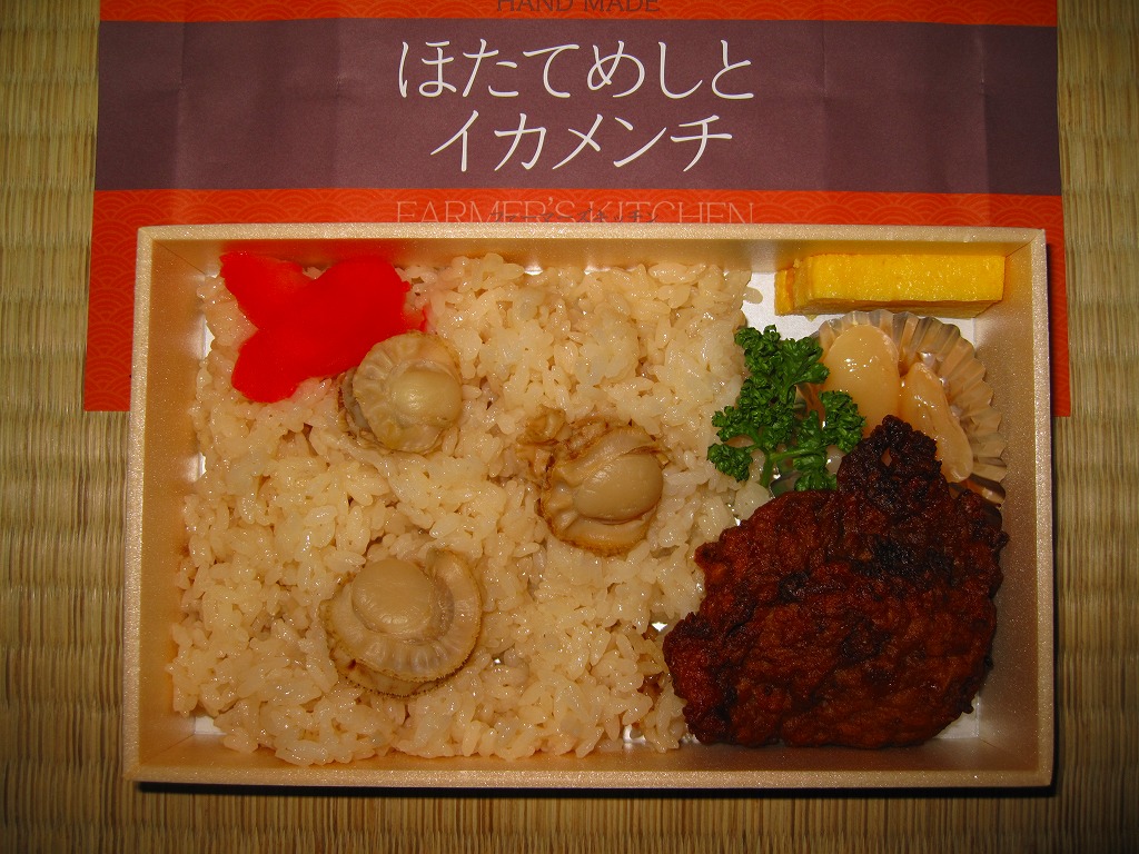 東北新幹線の新青森駅までの延伸開業を見据えて、2010(平成22)年8月までに勢揃いした「津軽弁」のひとつ。長方形の容器に木目柄のボール紙でふたをして、商品名をシンプルに描いた赤色基調の掛紙を巻く。中身はその名前のとおり、餅米混じりのホタテ飯と刻みイカの揚げ物が入り、白花豆と玉子焼を添え、パセリと紅生姜で彩るもの。価格も内容も分量も自然体で、街おこし駅弁にありがちな力の入りすぎ、入れすぎがまったく感じられず、鉄道や地域に溶け込んだ活躍が期待できると思う。価格は2011年の購入時で600円、2014年時点で650円、2017年時点で700円、2018年時点で750円。2018年までの販売か。