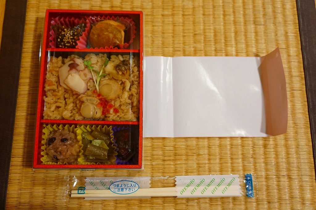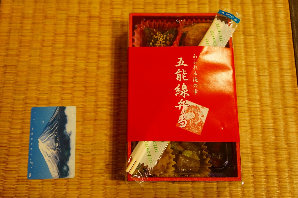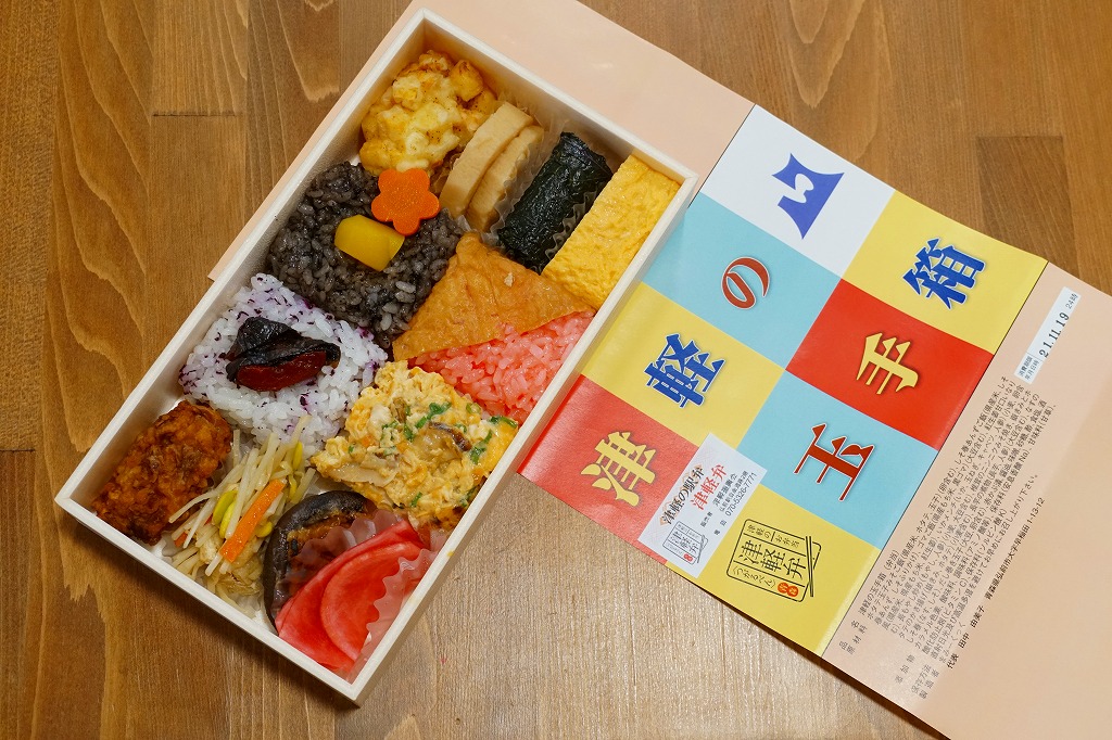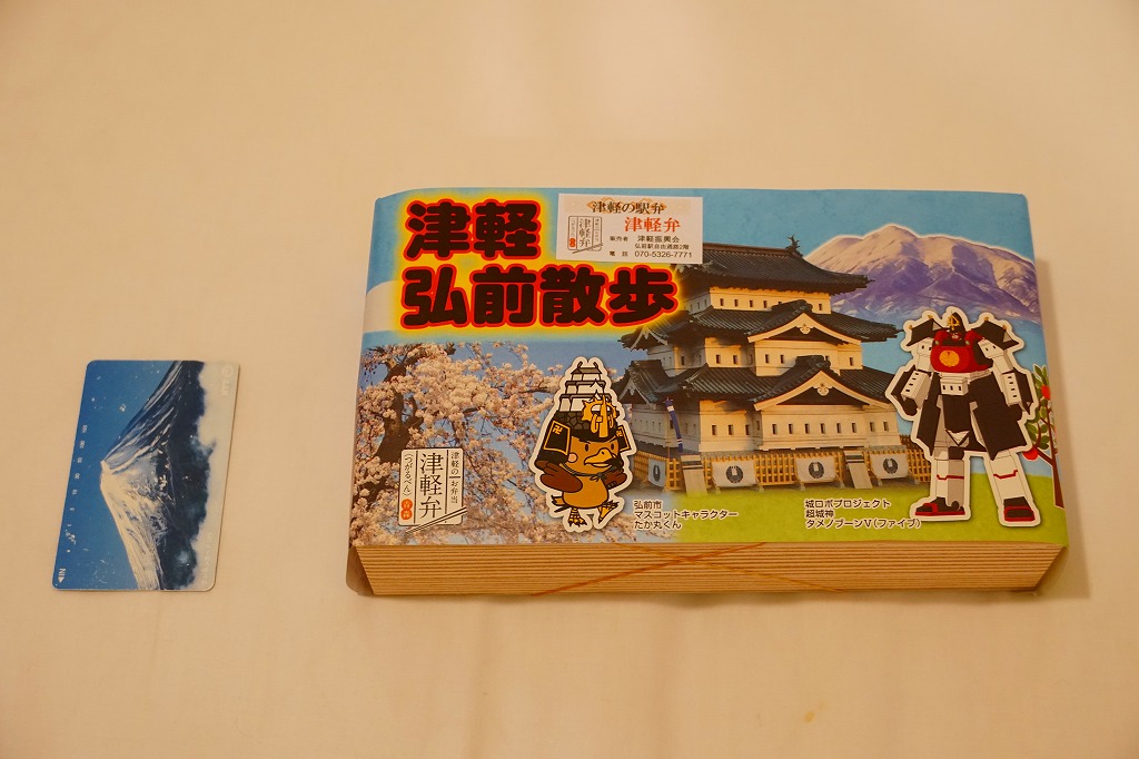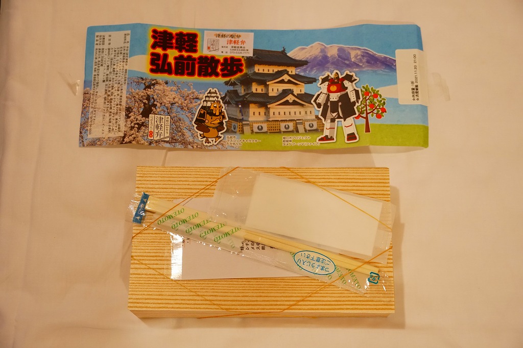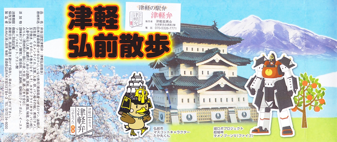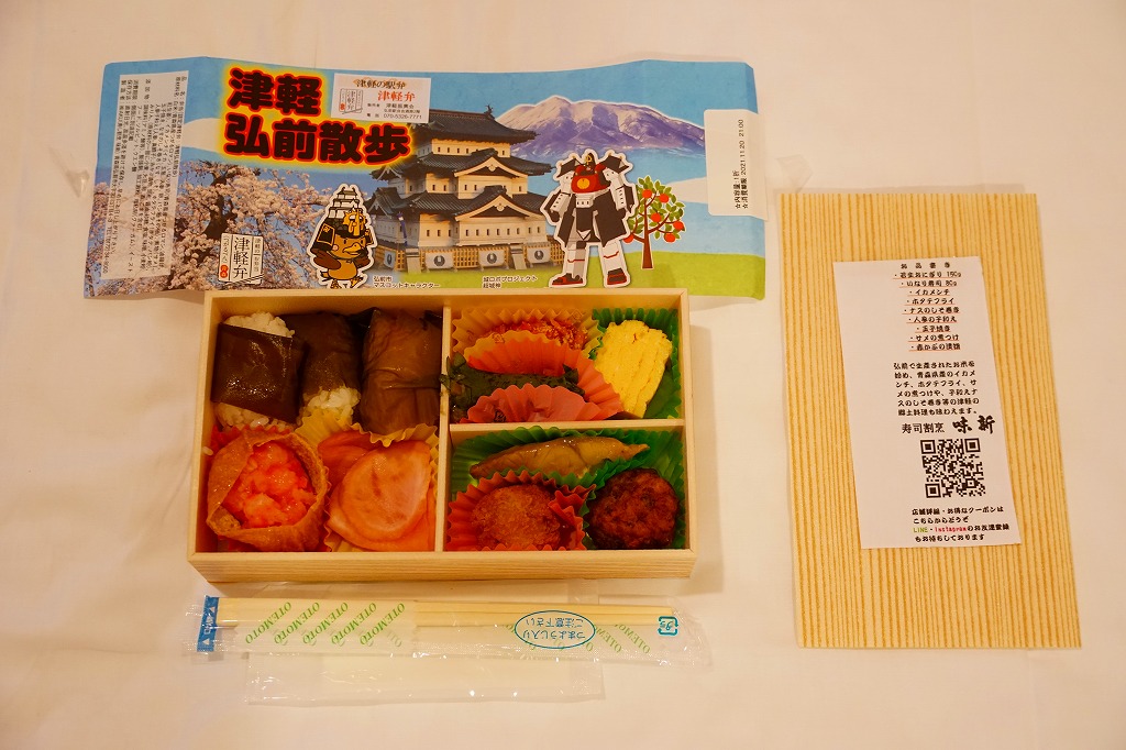 掛紙には弘前城と桜と岩木山に、弘前市と弘前城のキャラクターを描く。中身はお品書きにあるとおり、若生(わかおい)おにぎり150グラム、いなり寿司80グラム、イカメンチ、ホタテフライ、ナスのしそ巻き、人参の子和え、玉子焼き、サメの煮つけ、赤かぶの漬物。まるで居酒屋のメニューを詰めたような印象で、豊かなおかずや揚げ物を楽しめる。若生おにぎりは青森県津軽の郷土料理で、御飯を薄く柔らかい1年ものの昆布で巻いたもの。調製元は弘前市街の寿司割烹。