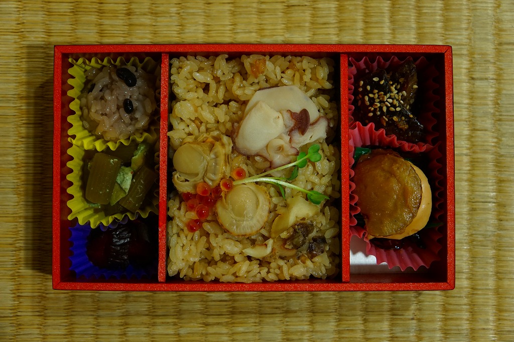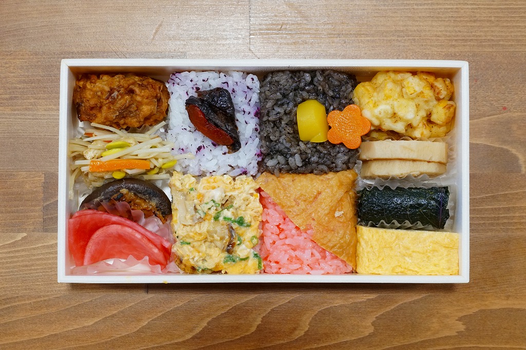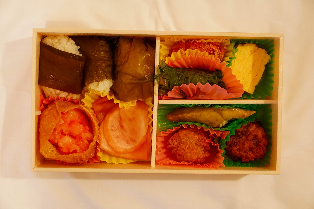 長方形の容器に、ホタテ玉子みそ御飯、しそ巻あんず御飯、ゴマ御飯、紅生姜甘口いなり風御飯、いかメンチと長もやし炒め、椎茸のニンニクみそ焼きと赤かぶ漬、嶽きみとホタテのかき揚げと長芋の煮物、ナスのしそ巻と玉子焼を、同じ正方形の面積で敷き詰める。市販のお弁当ブックに掲載されていそうな、形状と色彩で視覚に優れた構成に見える、手作り感があり、食べやすい内容。調製元は弘前の住宅地で昼間だけ営業する小さな惣菜店。