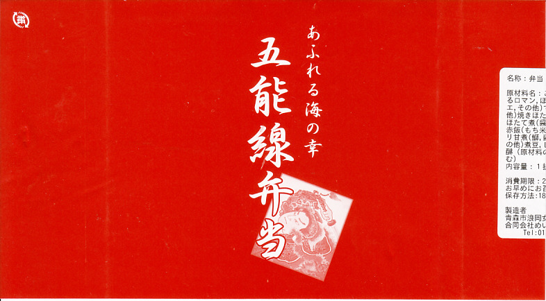 駅弁・空弁・津軽弁プロジェクト実行委員会による「津軽弁」に、2013(平成25)年に追加された弁当。赤い掛紙を巻く赤い容器の中身は、ホタテとサザエを載せたタコ飯に、赤飯もち、焼ホタテ、ブリ甘煮、フキ、柴漬けなど。中身や価格は一定していないのか、ネット上には同じ名前と掛紙と容器と調製元で、中身が異なるものが各種出てくる。価格は2015年の購入時で980円、公式にはおそらく1,080円、2019年時点で1,100円。