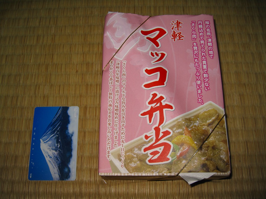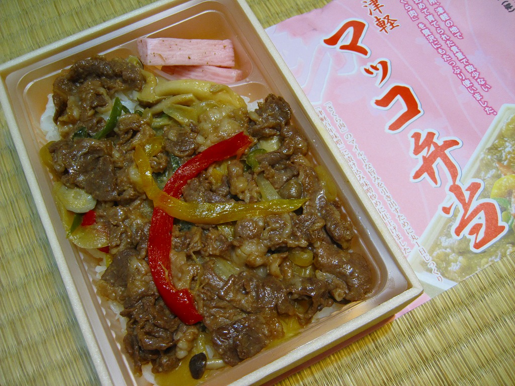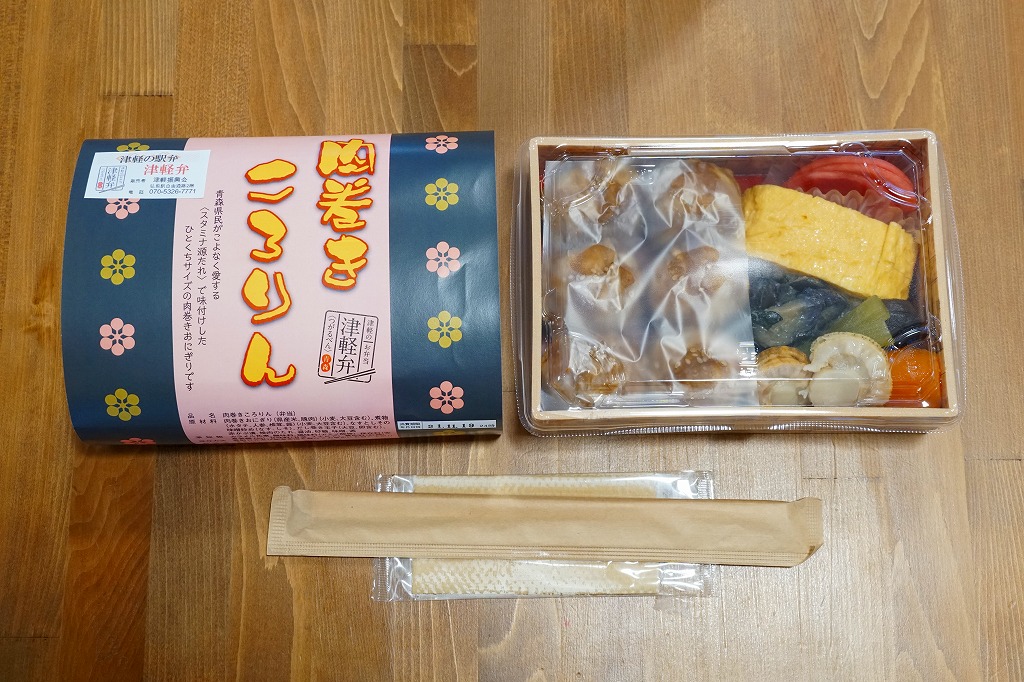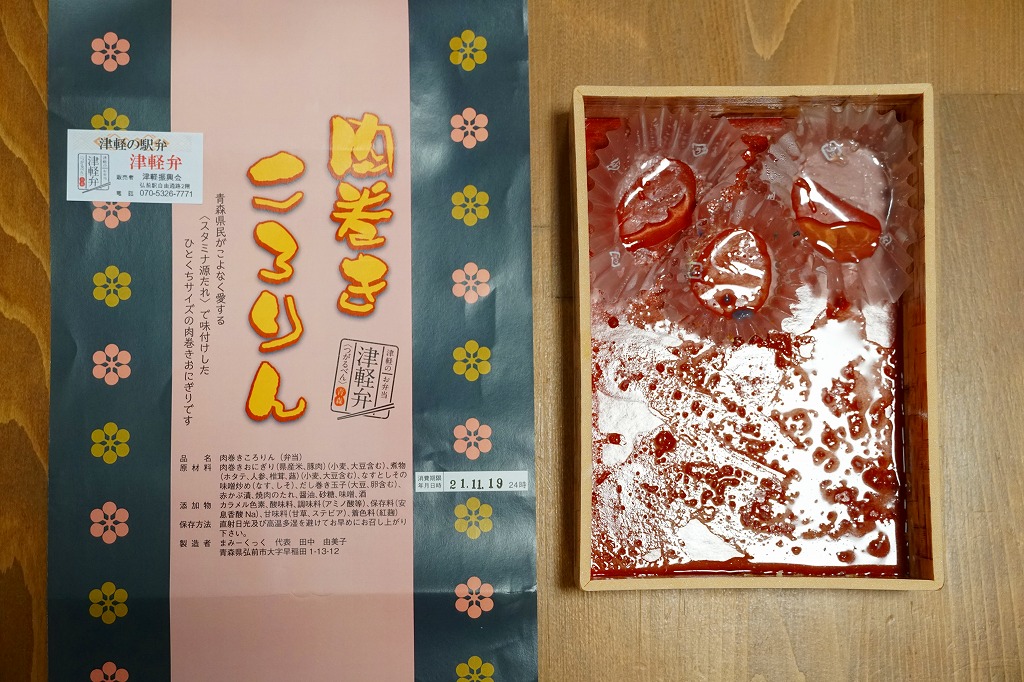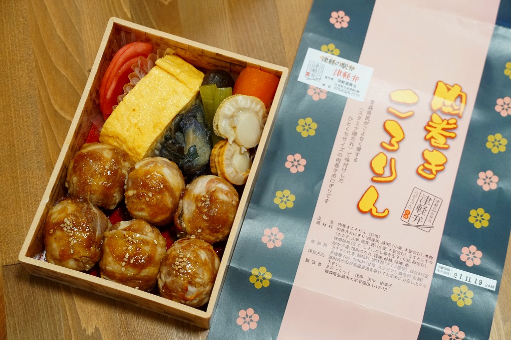 四角い容器の中に、白飯を豚肉で巻いてタレをまとう玉を6個、大きな玉子焼、ホタテやニンジンなどの煮物、ナスとしとの味噌炒め、赤かぶ漬を詰める。つまり、肉巻きおにぎりのお弁当。小柄と小粒で食べやすく、駅弁としては値段もお手頃。津軽や弘前がどこにあるかというと、青森県産米の使用と、タレが青森県民に愛される「スタミナ源たれ」であることにある。調製元は弘前の住宅地で昼間だけ営業する小さな惣菜店。