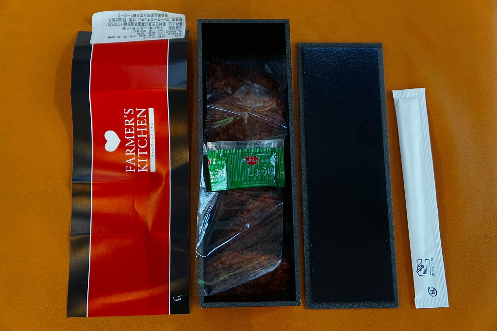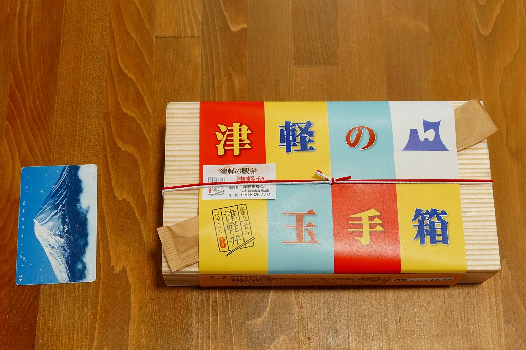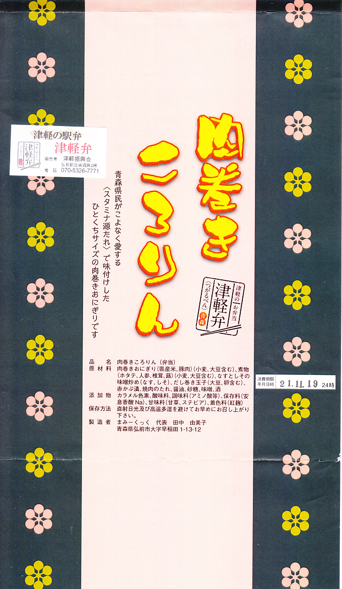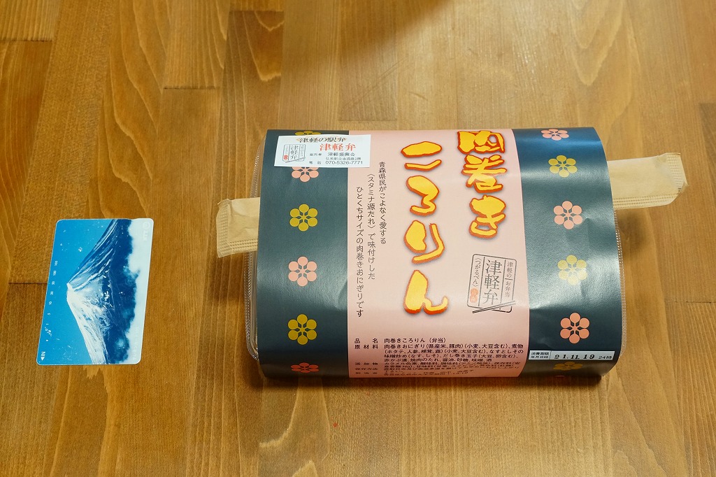 四角い容器の中に、白飯を豚肉で巻いてタレをまとう玉を6個、大きな玉子焼、ホタテやニンジンなどの煮物、ナスとしとの味噌炒め、赤かぶ漬を詰める。つまり、肉巻きおにぎりのお弁当。小柄と小粒で食べやすく、駅弁としては値段もお手頃。津軽や弘前がどこにあるかというと、青森県産米の使用と、タレが青森県民に愛される「スタミナ源たれ」であることにある。調製元は弘前の住宅地で昼間だけ営業する小さな惣菜店。