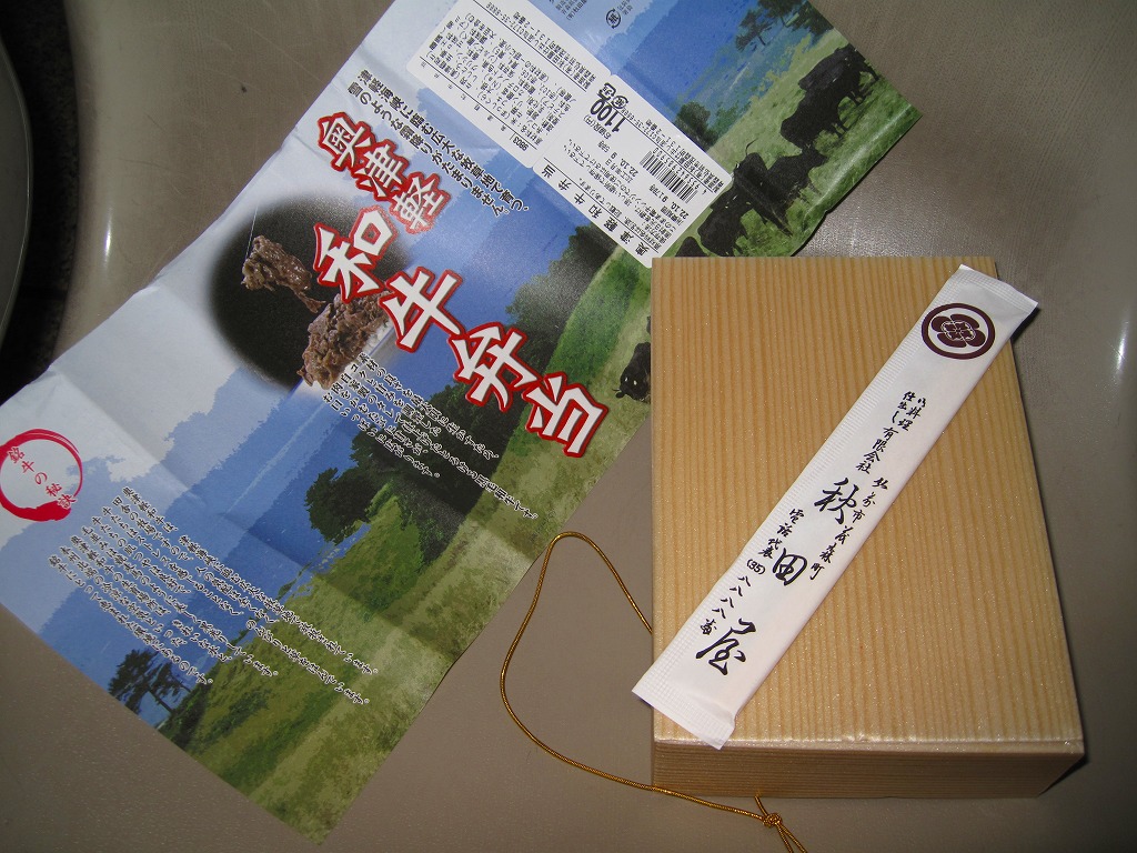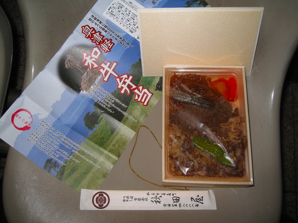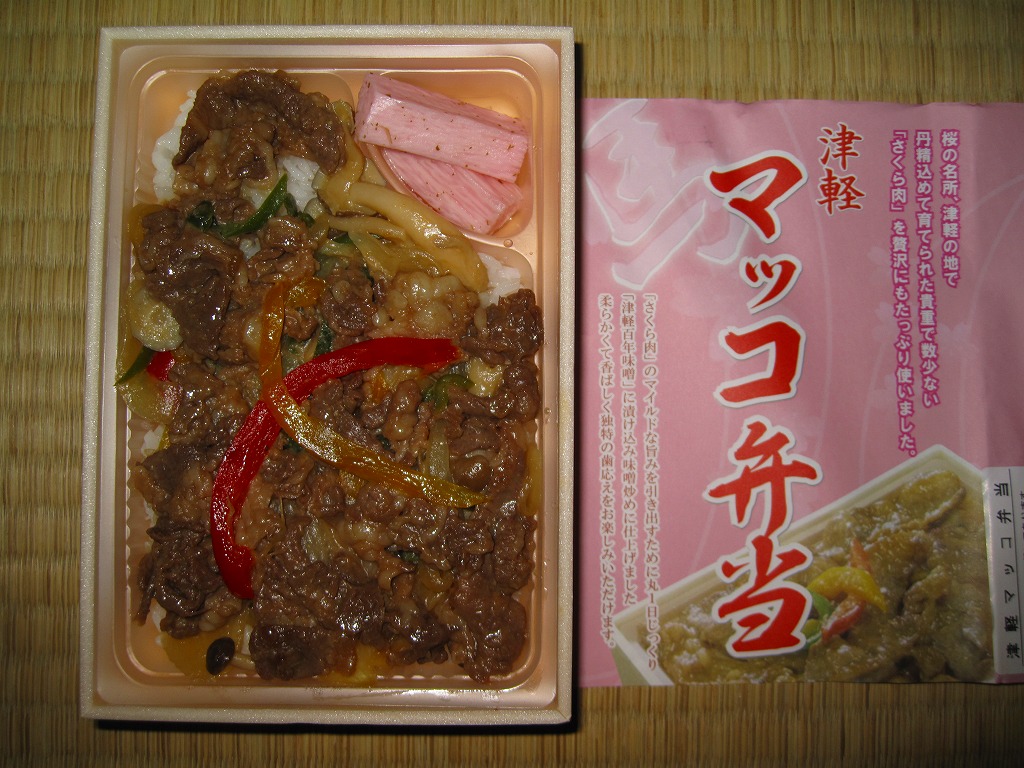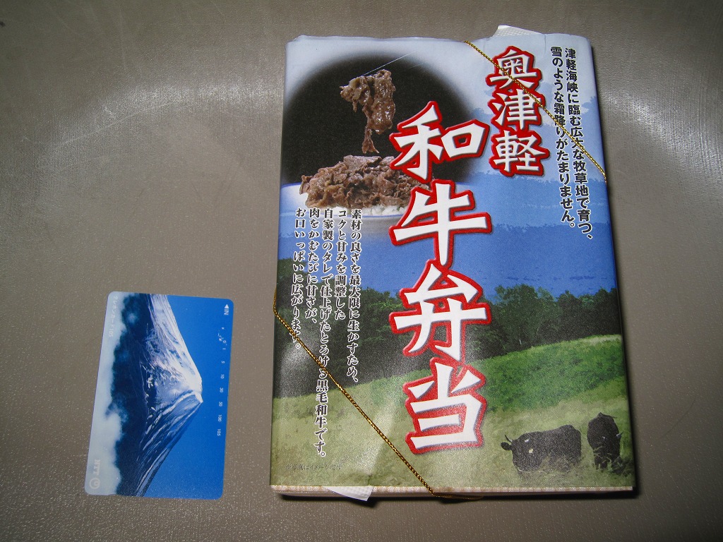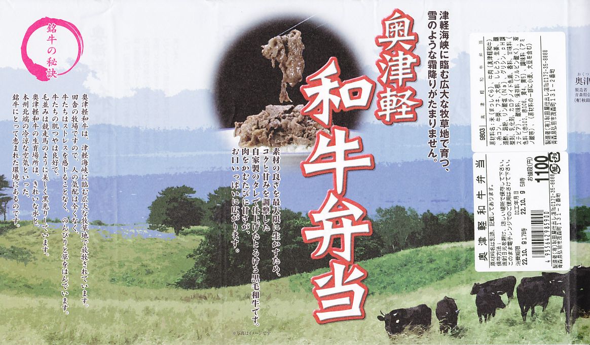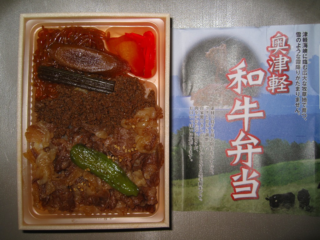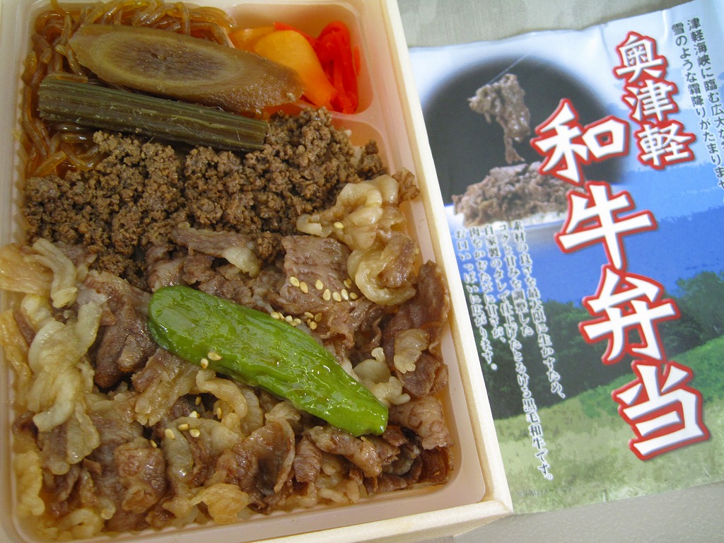 東北新幹線の新青森駅までの延伸開業を見据えて、2010(平成22)年8月までに勢揃いした「津軽弁」のひとつで、これは4月の発売か。そこそこ深い長方形の容器に、津軽と海峡の風景や中身のイメージを写真で掲載した掛紙を巻く。半透明のプラ製トレーに収まる中身は、「まっしぐら」白御飯の上を、奥津軽和牛のそぼろとすき焼き肉に糸こんにゃくで覆い、ゴボウ、フキ、ししとう、生姜、大根を添えるもの。牛肉の適度な柔らかさと脂身と優れた風味はかなりのもので、今回の駅弁大会会場の普段の姿「駅弁屋旨囲門」で買える牛肉駅弁を凌ぐと思う。肉の分量も惜しみない。1年間ほどの販売か。