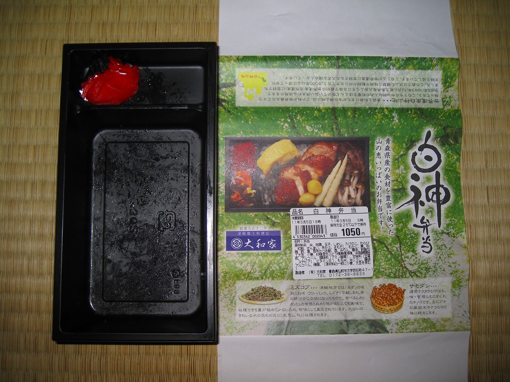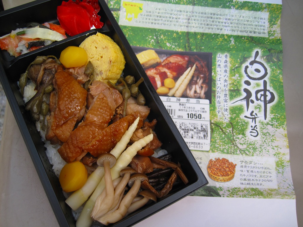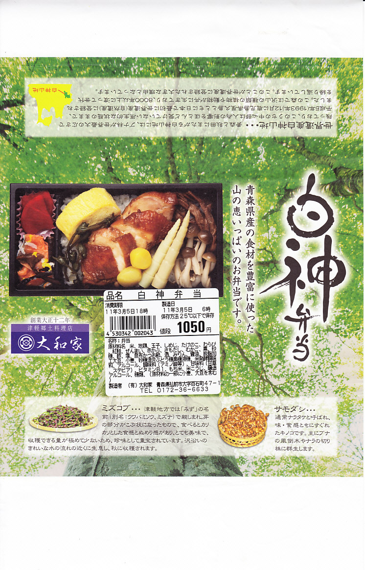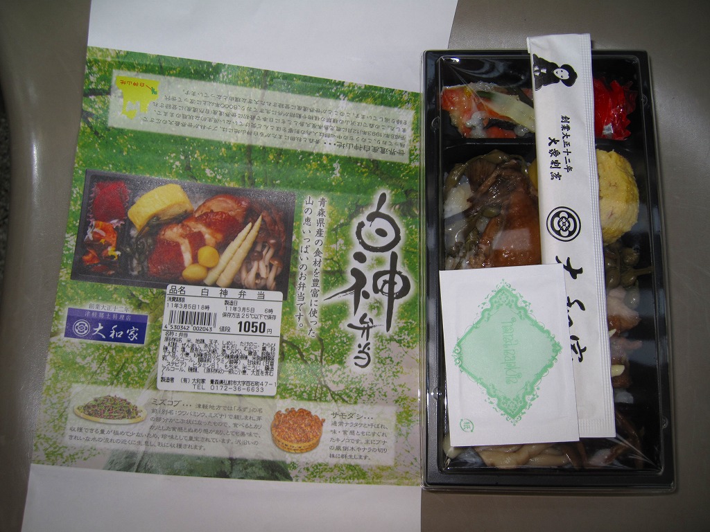 弘前駅から世界自然遺産の白神山地までは距離も時間も長い印象があるが、白神を名乗る駅弁がたくさんある秋田駅のほうが距離では倍も遠い。しかも登録面積の74%は青森県側であったり、秋田県側ではブナ林の伐採のための林道が完成していたりと、白神山地を世界遺産まで押し上げた功績は青森県側にあるような気もする。なお、この調製元は同じ名前の青森空弁を以前から販売していた。2012年頃までの販売か。