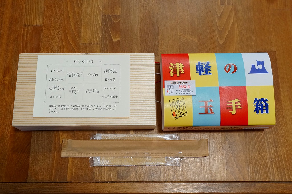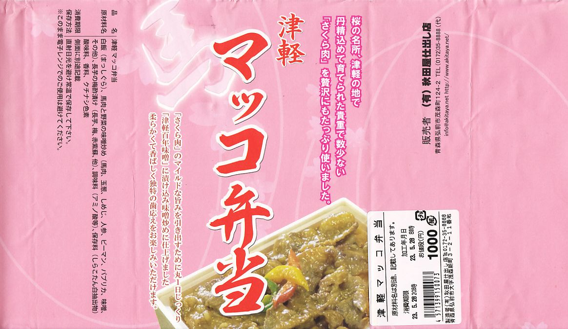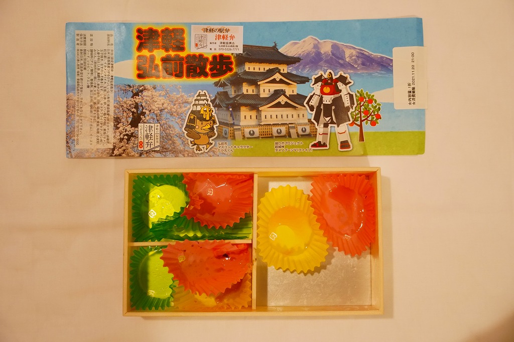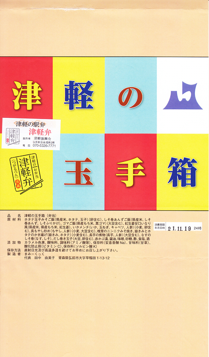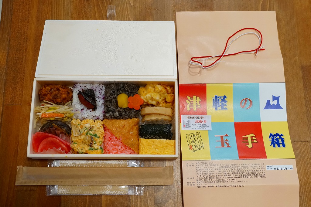 弘前観光コンベンション協会の弘前駅自由通路等にぎわい創出事業実行委員会による、津軽のお弁当「津軽弁」に、2021(令和3)年3月に新たに仲間入りした14商品のうちひとつ。今までの「津軽弁」と同じく、弘前駅の改札口に面した自由通路「あずましろ〜ど」で、机や什器を並べて販売する。