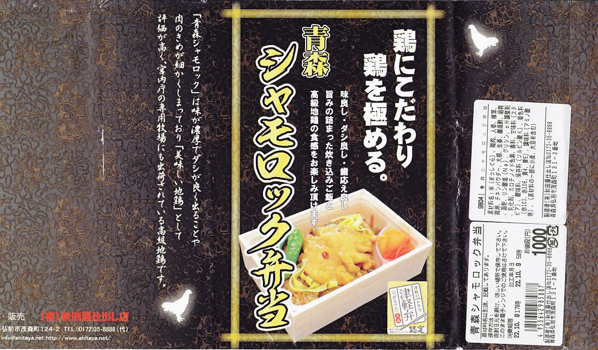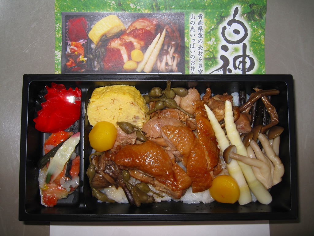 東北新幹線の新青森開業を見据えて、2010(平成22)年8月までに勢揃いした「津軽弁」のひとつ。黒いプラ製トレーを接着した長方形の容器に透明なふたをして、中身と森の写真に様々な解説文を印刷した掛紙で巻く。中身は白御飯の上に鶏肉煮の皮付きぶつ切り、ごわっとした玉子焼、ミズコブやサモダシといったきのこや山菜を盛り付け、鮭の和え物と赤カブを添えるもの。個性派でワイルドな鶏飯駅弁。何の解説も見つからない塩辛めなサケの和え物が何なのかが気になる。
