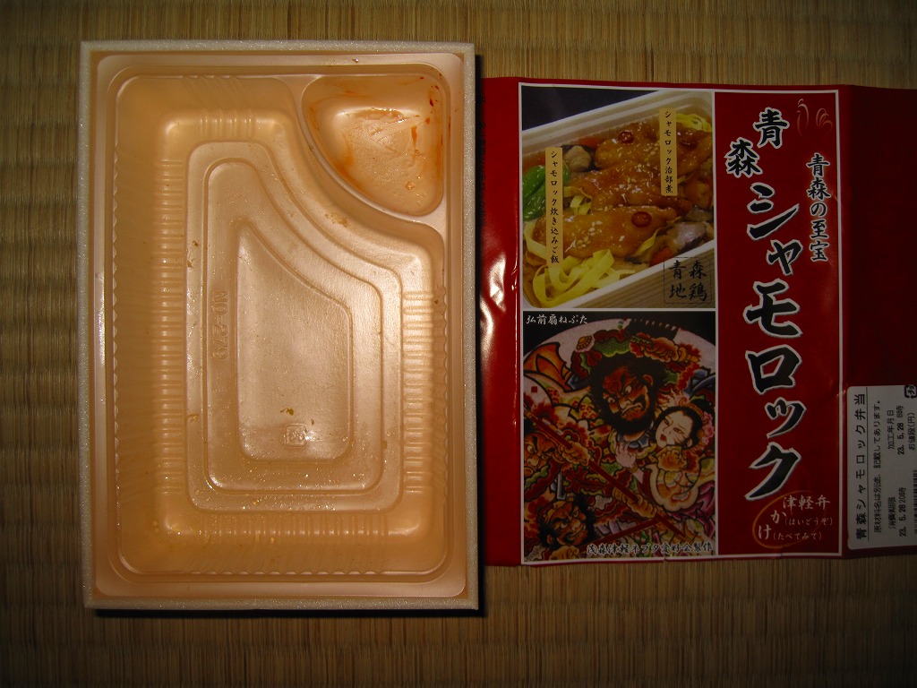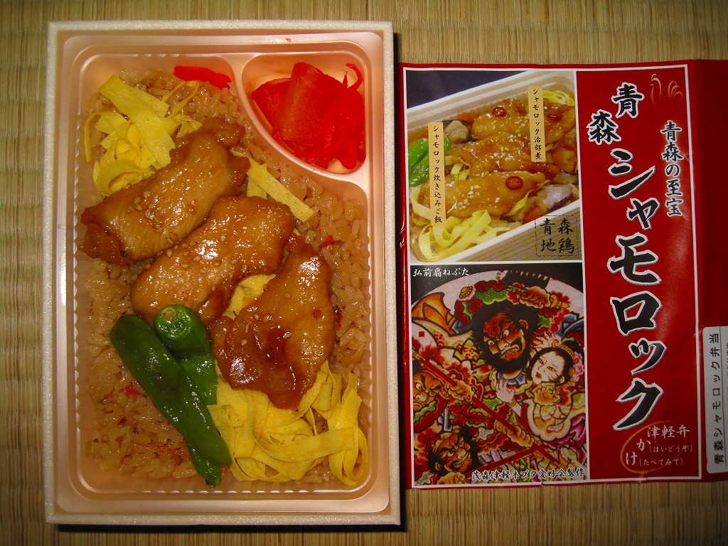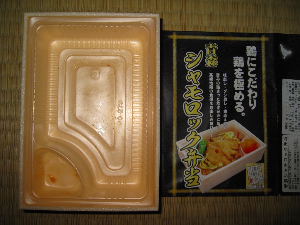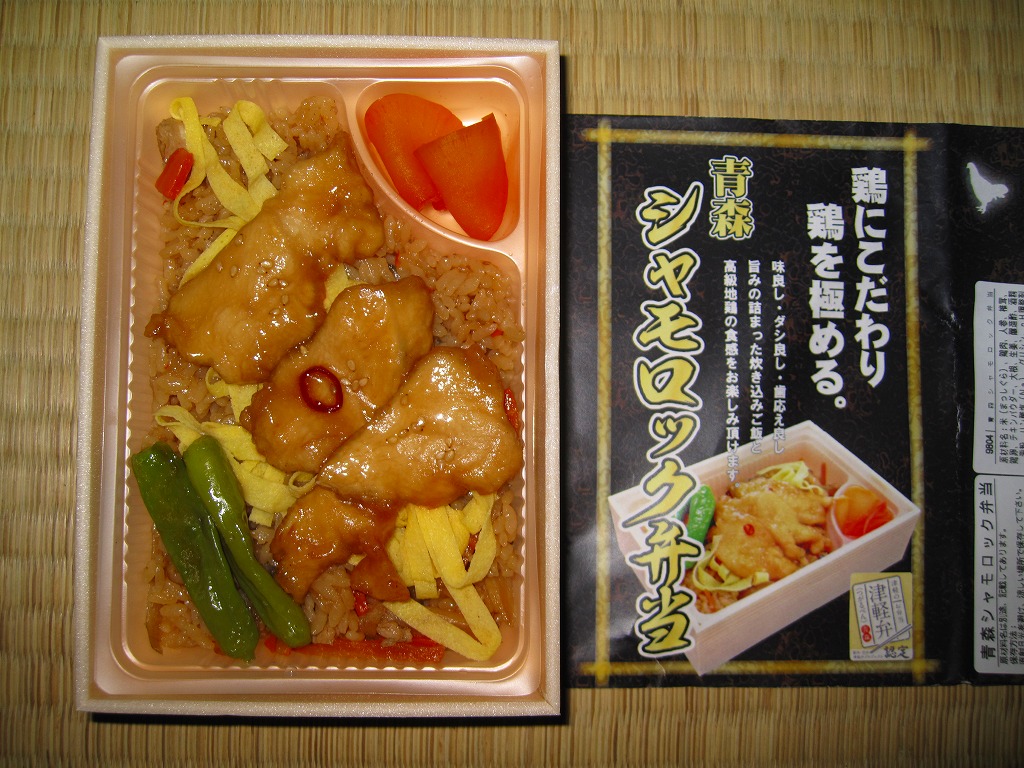 上記の駅弁「青森シャモロック弁当」の、2011(平成23)年5月時点での姿。掛紙の見た目がまるで違ったため、新作か未収穫作でも出たのかと思って購入したが、中身と価格は以前とまったく同じだった。