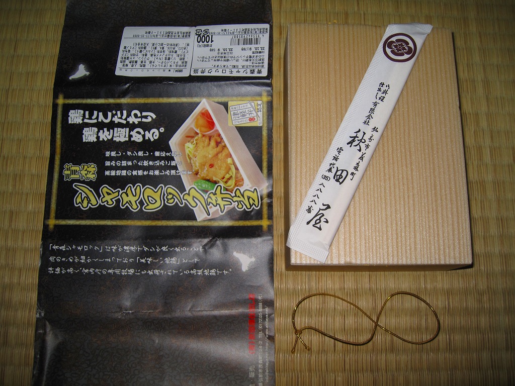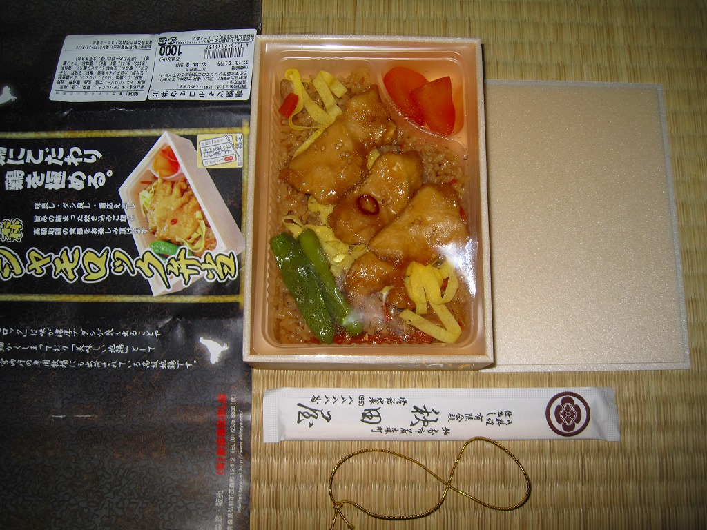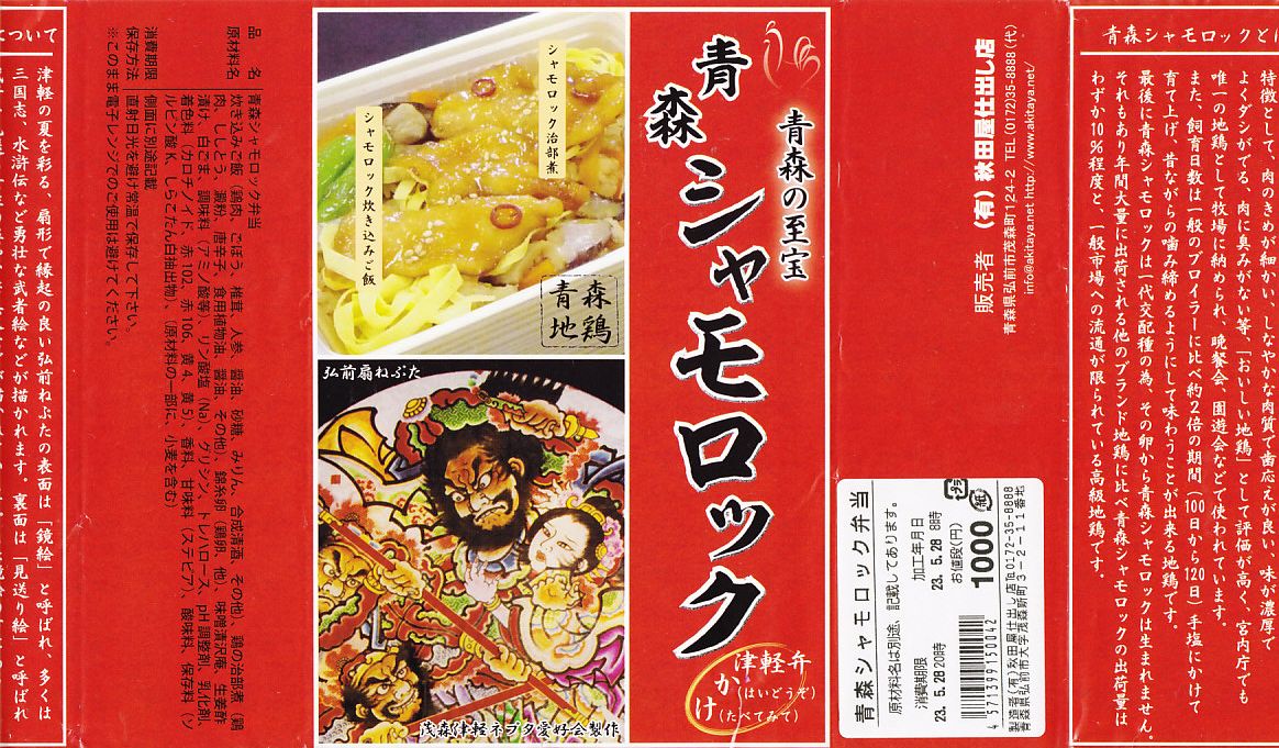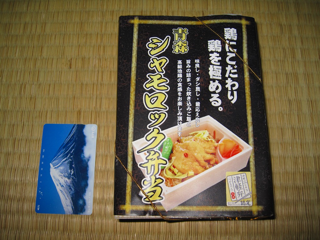 上記の駅弁「青森シャモロック弁当」の、2011(平成23)年5月時点での姿。掛紙の見た目がまるで違ったため、新作か未収穫作でも出たのかと思って購入したが、中身と価格は以前とまったく同じだった。