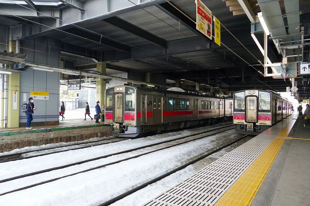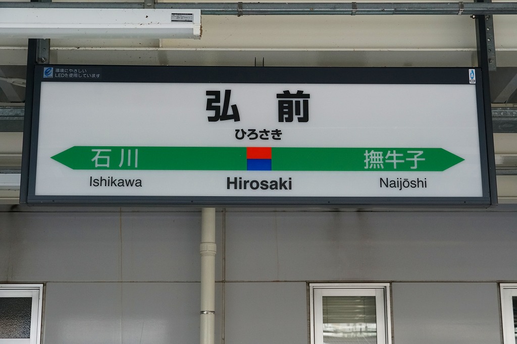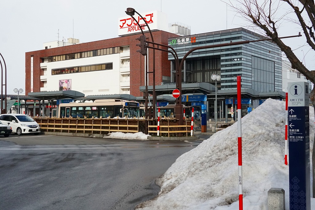 青森駅や新青森駅から、特急電車で約30分、奥羽本線に五能線列車が乗り入れ、弘南鉄道が接続する駅。弘前市は青森県の西部で津軽平野の奥部に位置する、人口約16万人の城下町。生産量日本一のリンゴや、桜祭りで有名な弘前城で知られるほか、青森県津軽地方の政治や経済の中心地である。駅弁は近年、国鉄時代からの駅弁屋や地元の業者の弁当を、出しては止めての繰り返し。1894(明治27)年12月1日開業、青森県弘前市表町。