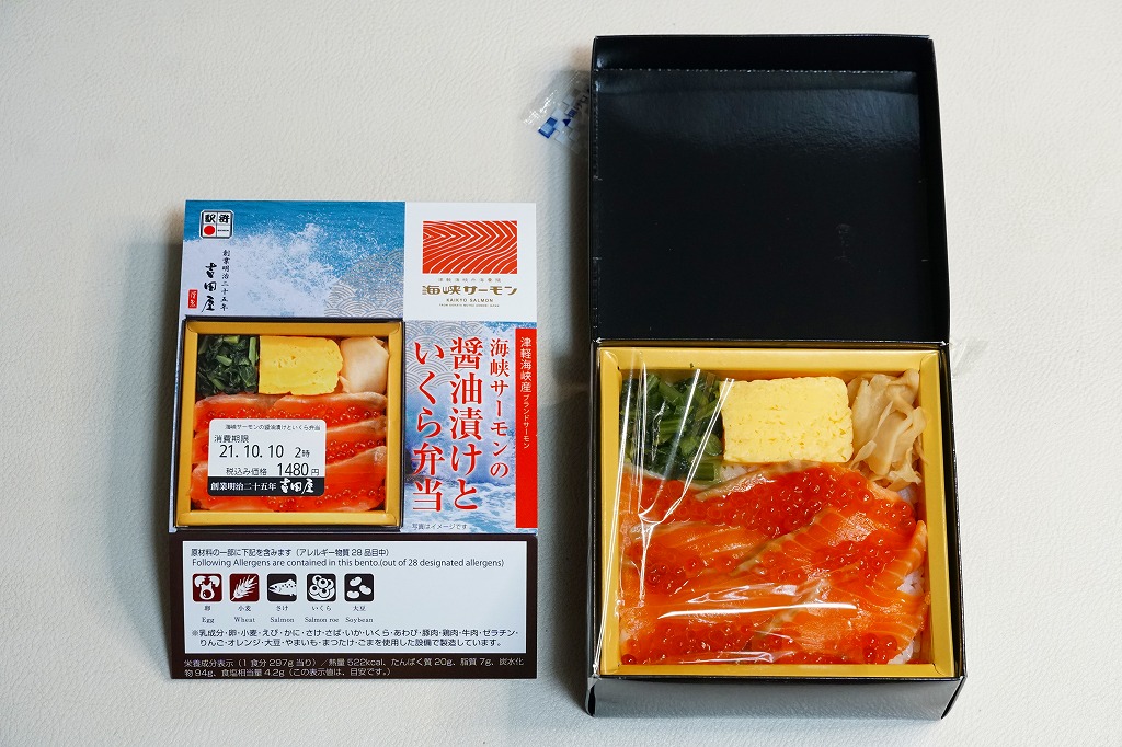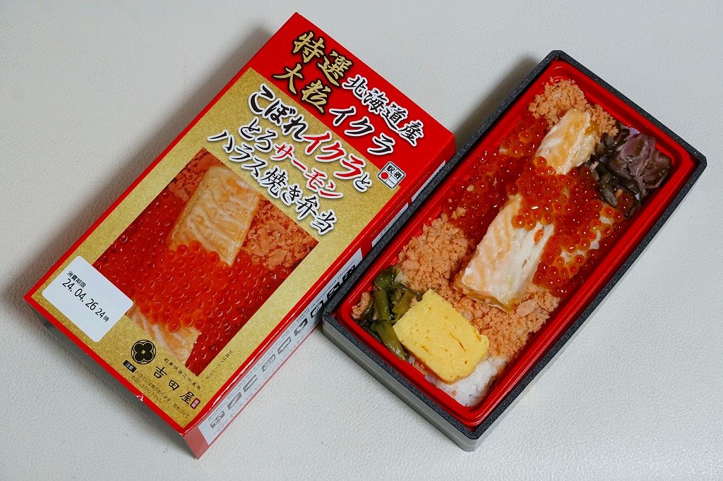 商品名と中身のクローズアップ写真を印刷したスリーブに収める長方形のプラ容器に、白飯を詰め、イクラと鮭フレークで覆い、サーモンハラス焼きを載せ、玉子焼、野沢菜しょうゆ漬、柴漬けを添える。脂が乗りすぎるようなハラスと、脂のないフレークの二段構えで、鮭の味で飯が進む。