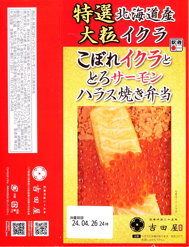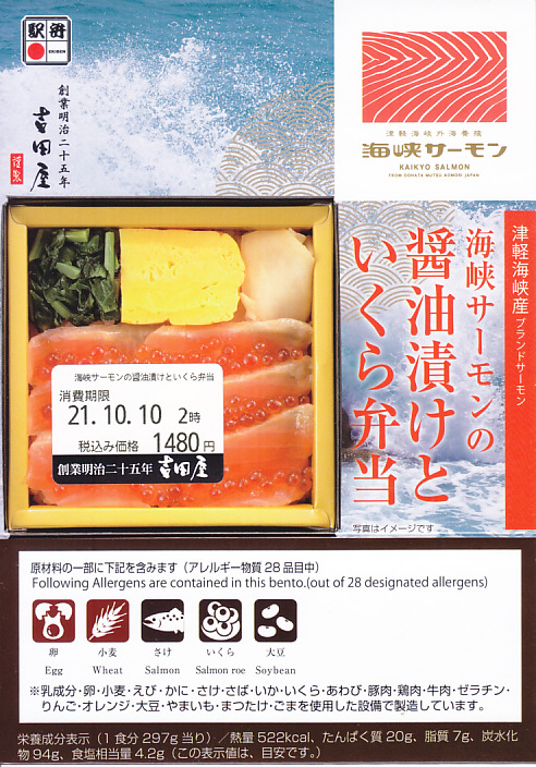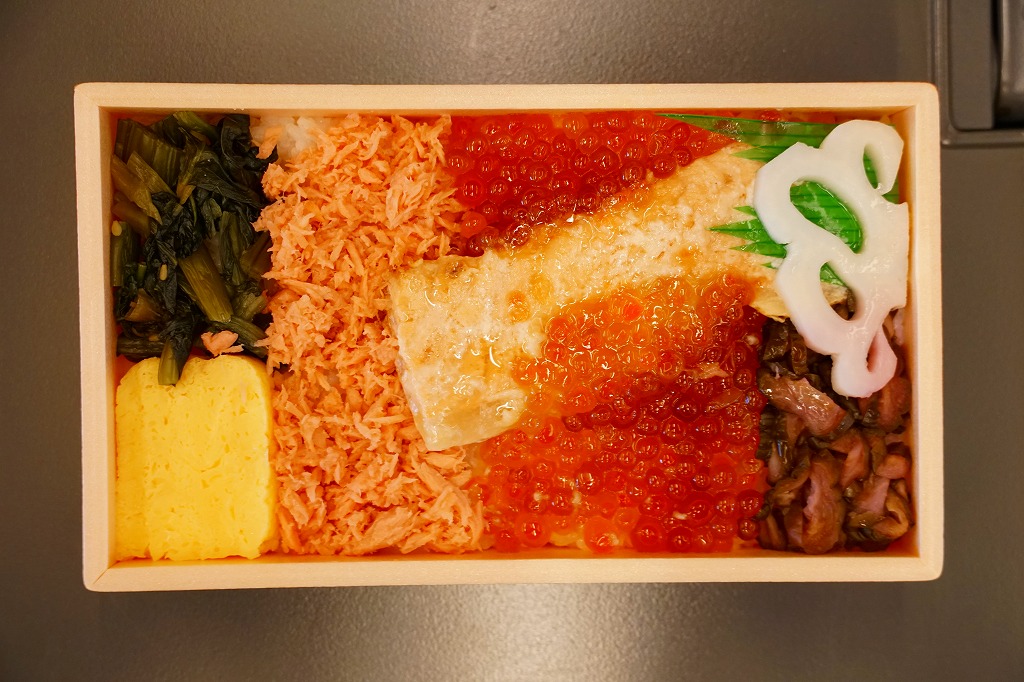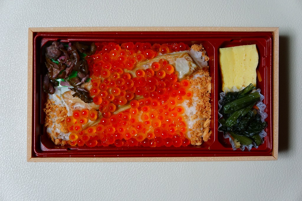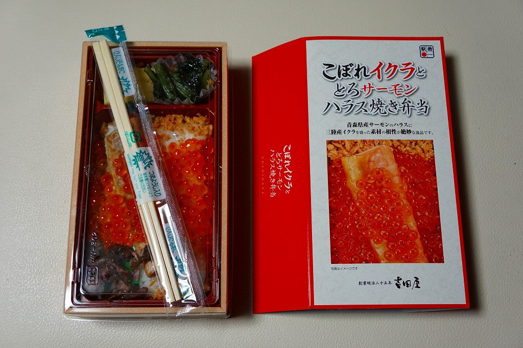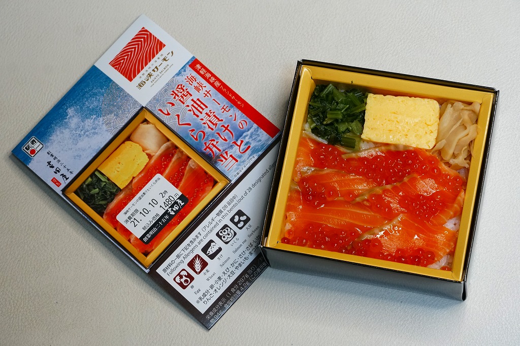 秋冬の駅弁大会シーズンに向けた、2023(令和5)年秋の新商品。調製元を見て八戸駅の駅弁としたが、八戸駅で買えたかは分からない。2024年の春までに、東海道新幹線の東京、品川、新横浜の各駅の駅弁売り場で売り始めた。その名からも内容からも、2015年発売の「こぼれイクラととろサーモンハラス焼き弁当」を手直して再発売したものではないかと思う。