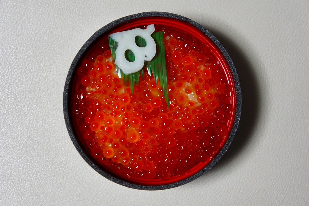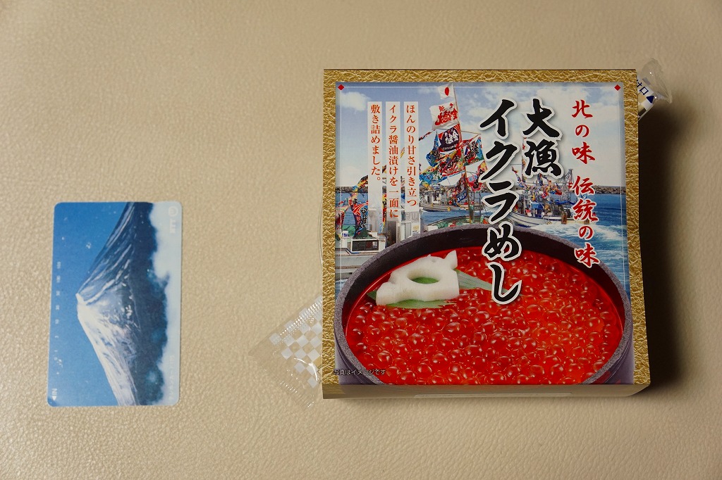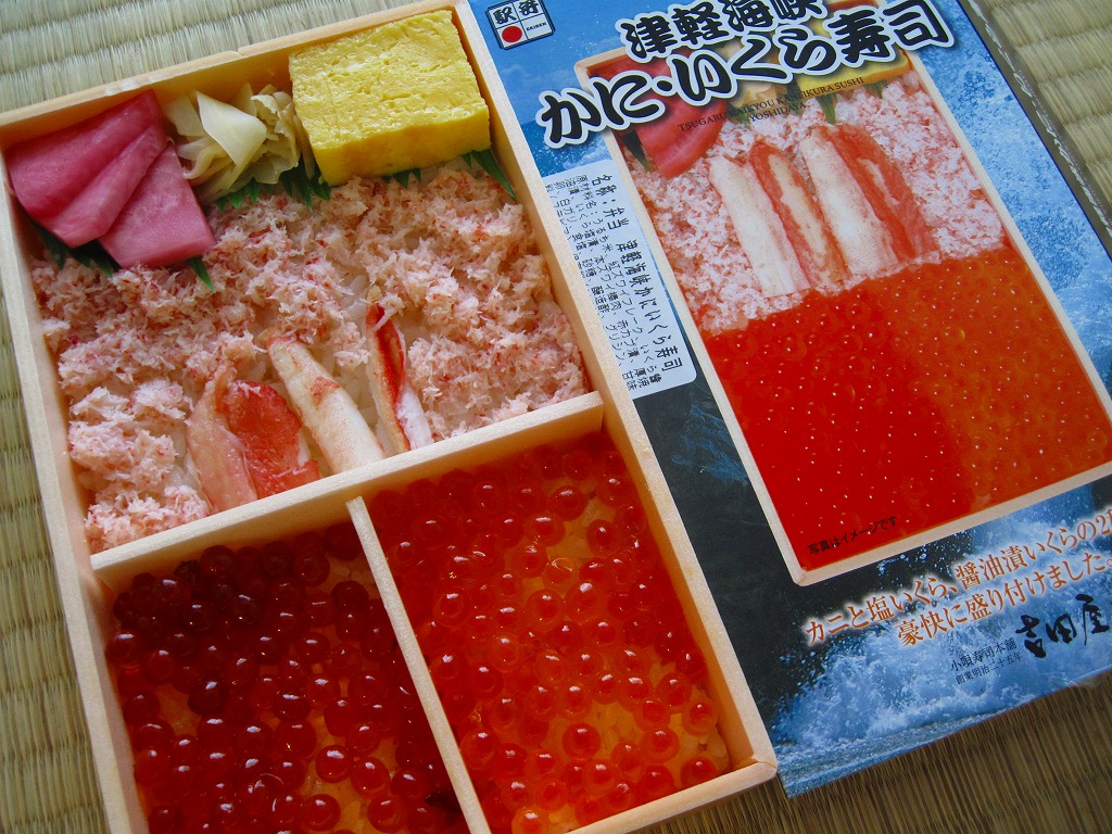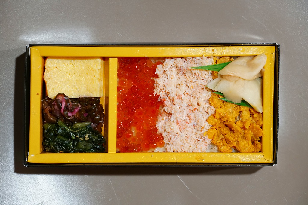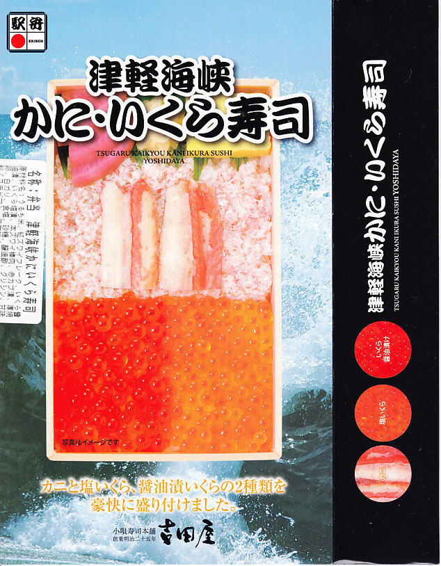 2010(平成22)年に発売か。浅く小さな長方形の容器に透明なふたをして、中身と海の写真を印刷したボール紙の枠にはめる。中身は酢飯の上にイクラ醤油漬、イクラ塩漬、ベニズワイガニのフレークとズワイガニの脚肉をそれぞれ詰めて、玉子焼、赤かぶ漬、ガリを添えるもの。