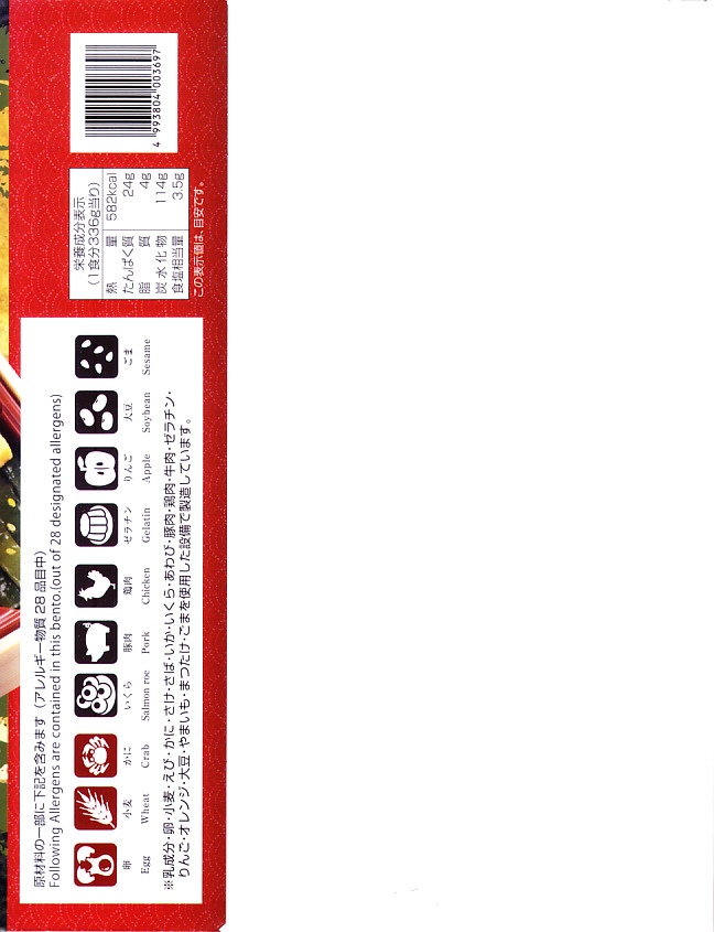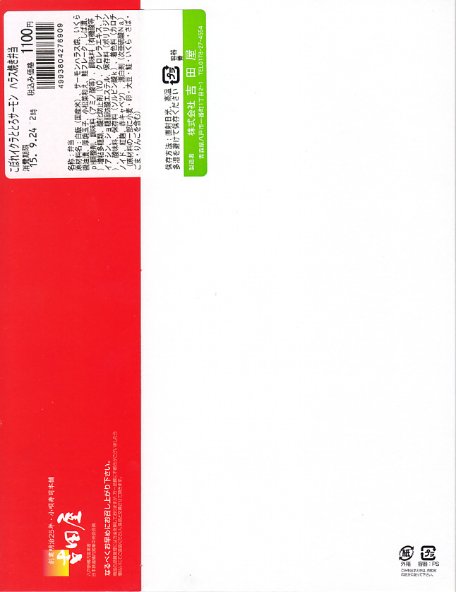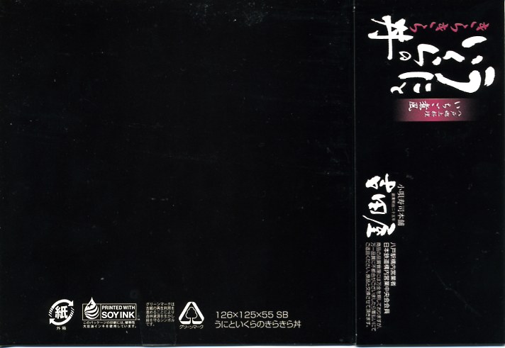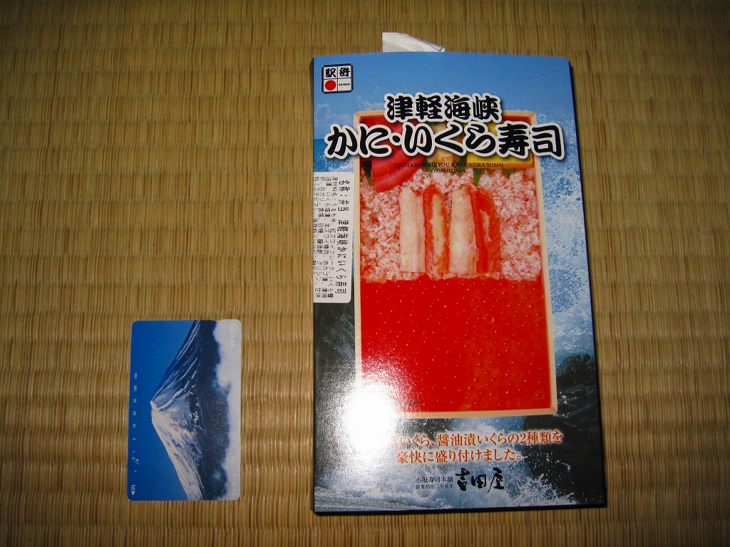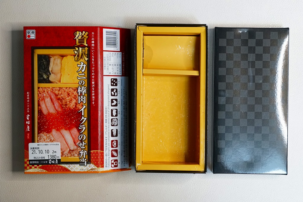 2010(平成22)年に発売か。浅く小さな長方形の容器に透明なふたをして、中身と海の写真を印刷したボール紙の枠にはめる。中身は酢飯の上にイクラ醤油漬、イクラ塩漬、ベニズワイガニのフレークとズワイガニの脚肉をそれぞれ詰めて、玉子焼、赤かぶ漬、ガリを添えるもの。